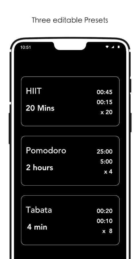 Встановлюєте інтервали різної тривалості за допомогою простого таймера для Андроїд Strive Intervals. Його зручно застосовувати для занять спортом і тренувань різного спрямування . Три вбудовані передустановки легко налаштовувати під свої потреби і регулювати. Програма містить 2 режими короткої та тривалої сесії, що складаються з тридцяти циклів. Ви можете в будь-який момент поставити паузу під час продуктивності і приділити час для відпочинку, а також вибрати певні періоди активності (мінімальний крок 5 секунд до 1 години).