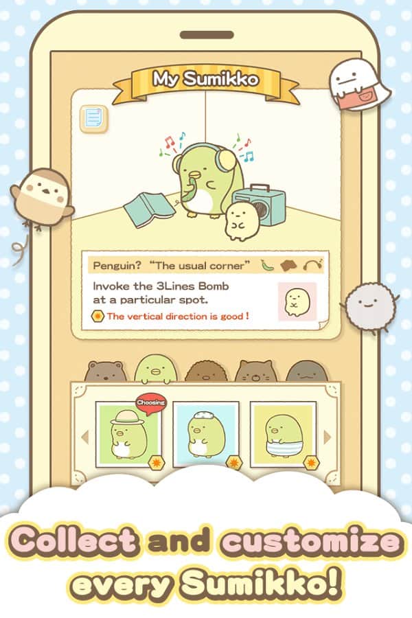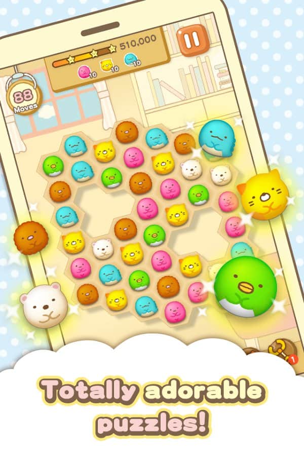 Sumikko gurashi-Puzzling Ways – захоплююча гра з жанру чотири в ряд на андроїд. У цій грі ви опинитеся в забавному світі численних милих мордочок тварин, де вашим завданням буде з'єднувати їх в ряди і прибирати з поля. Кожен новий рівень гри піднесе вам нові завдання і місії, де ви будете прибирати з поля певні кольори. Вирішуйте складні задачки і набирайте максимальну кількість зірок. Грайте під приємну музику і тренуйте свою відмінну реакцію і логіку складаючи по чотири і більше однакових мордочок в ряди по горизонталі, вертикалі і діагоналі. Використовуйте бонуси і посилення і швидше проходите рівні.