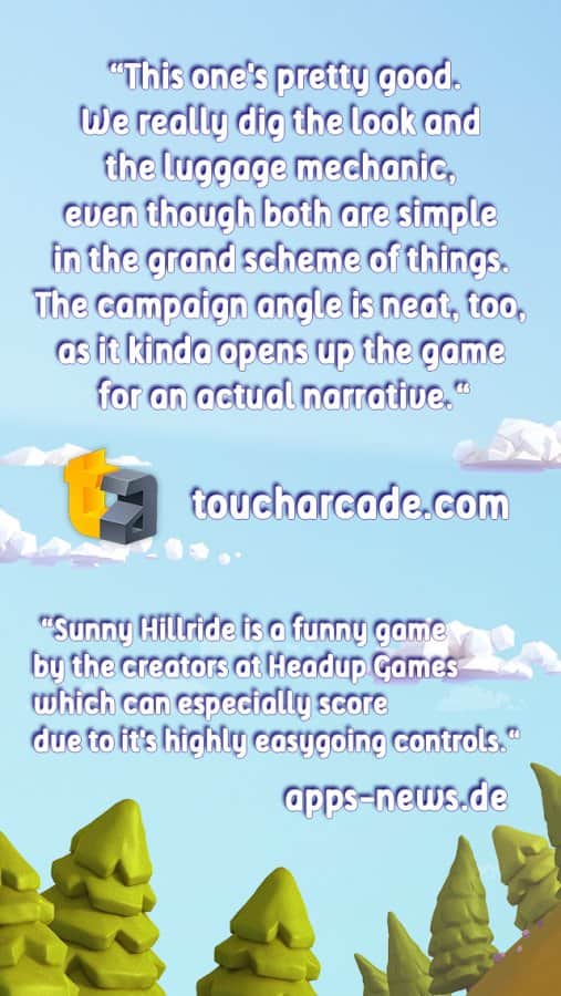 Sunny Hillride - игра на аndroid, в которой вы отправитесь в далёкое путешествие всей семьей на своем автомобиле. Вам предстоит ездить по холмам, проделывать всевозможные трюки и не растерять весь багаж по дороге. Собирайте по пути бонусы и сувениры и наслаждайтесь красивой и разнообразной графикой.