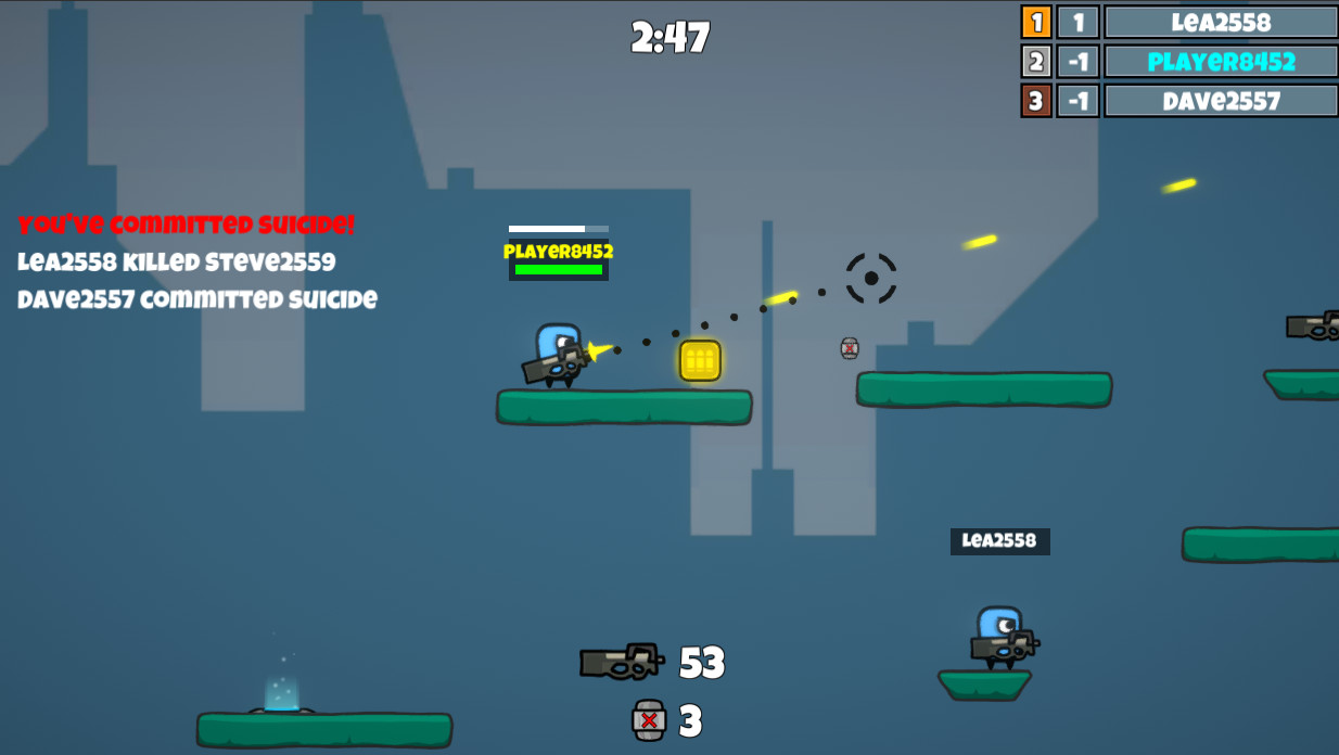 Super Shape Shooter — це динамічний і веселий 2D онлайн-шутер, у якому геометричні форми влаштовують божевільні перестрілки! Обирайте одного з трьох бійців, стрибайте по аренах, стріляйте, бійтесь з друзями або ботами та збирайте безліч веселих капелюхів, щоб вирізнятися серед інших. Весела та стрімка дія на шести різних картах чекає на вас!
