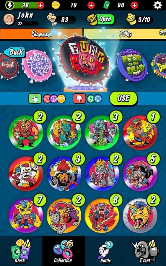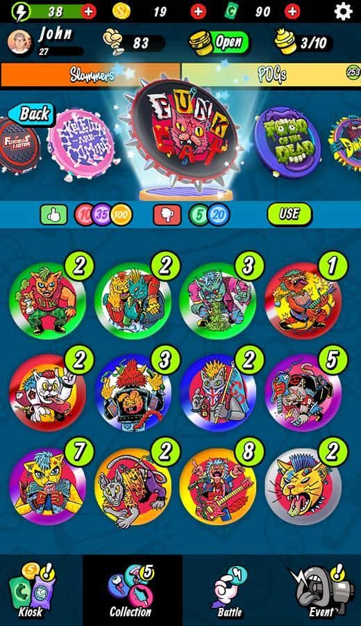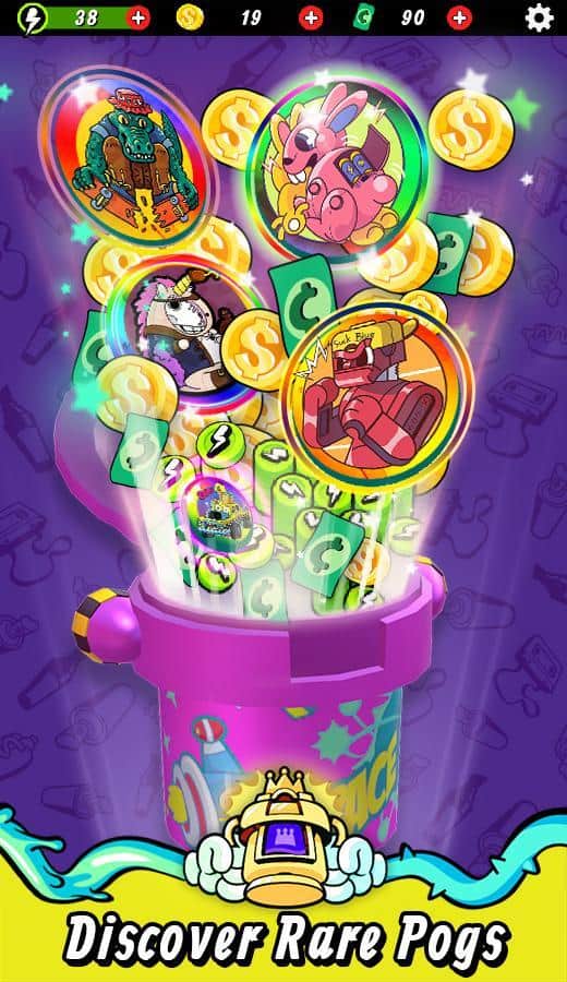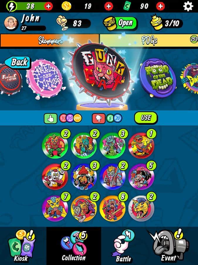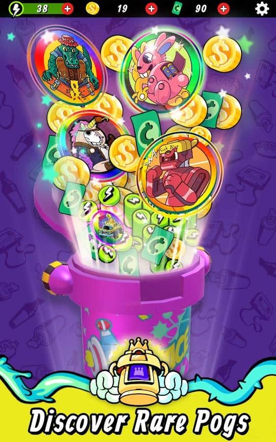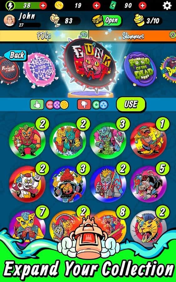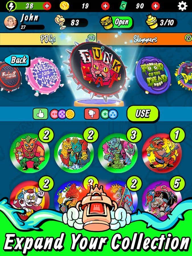 Super Slam - POGS Battle – весела гра на андроїд, де ви будете бити битою по кэпсам і перевертати їх. У грі вам необхідно буде зібрати свою неповторну колекцію кэпсов і виграти якомога більше монеток. Покажіть на ділі свою силу удару і розраховуйте точну траєкторію і точність, цілячись в ціль. Наносьте удари битою і намагайтеся перевернути всі фішки для того щоб отримати їх все і заробити довгоочікувані монетки. Купуйте на зароблені гроші колекційні фішки і нові унікальні біти. Грайте зі своїми друзями в цю захоплюючу гру і бийтеся з гравцями зі всього світу.