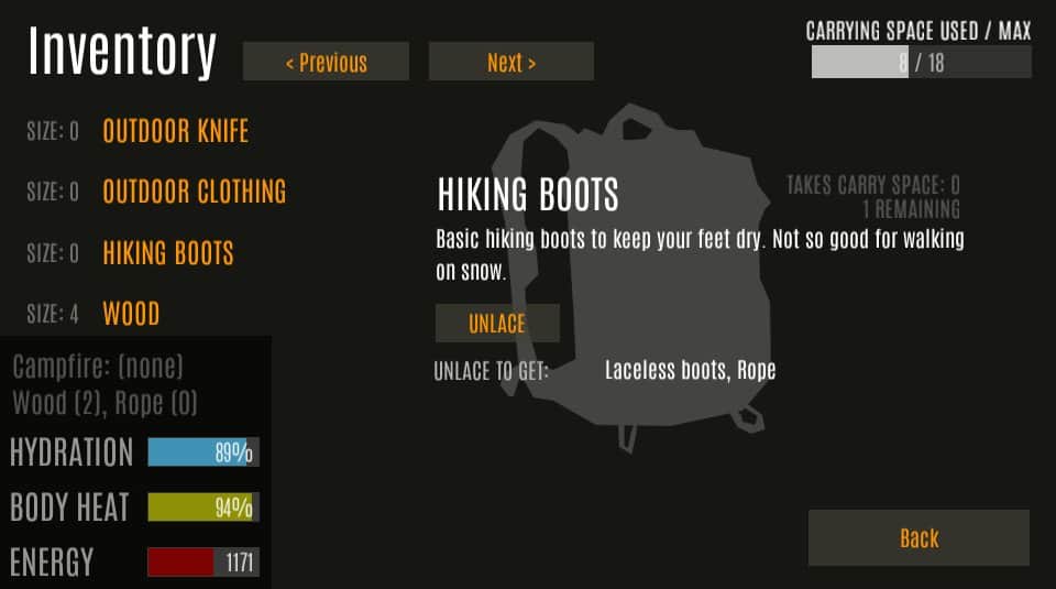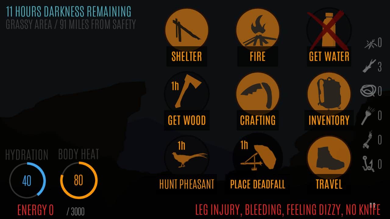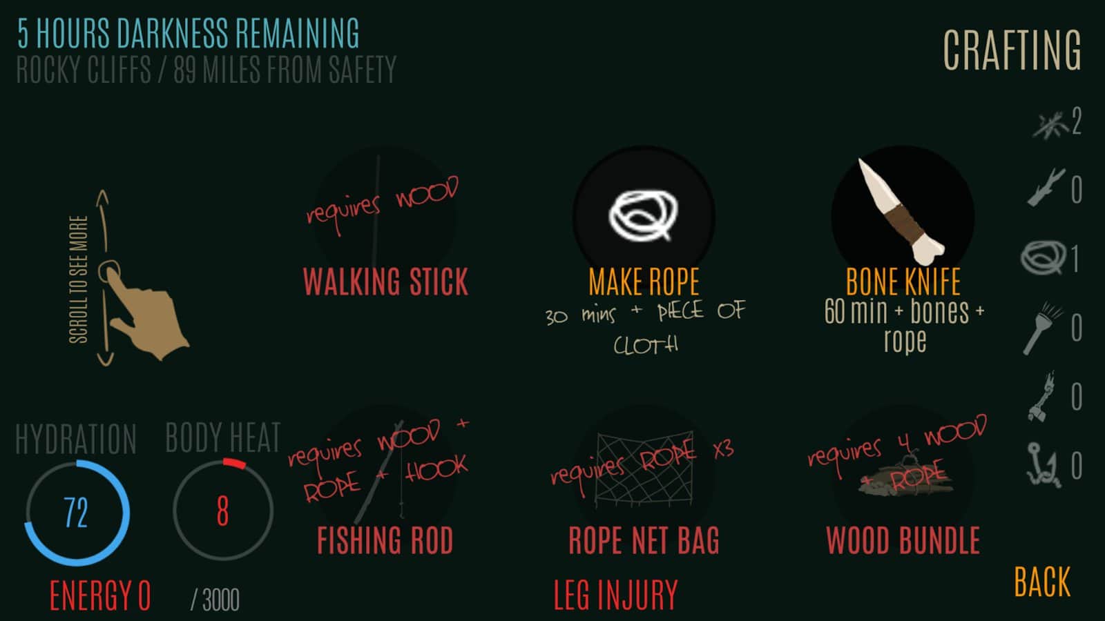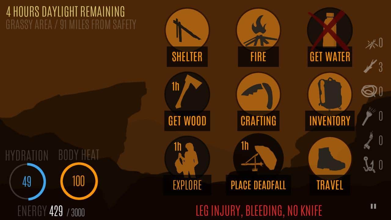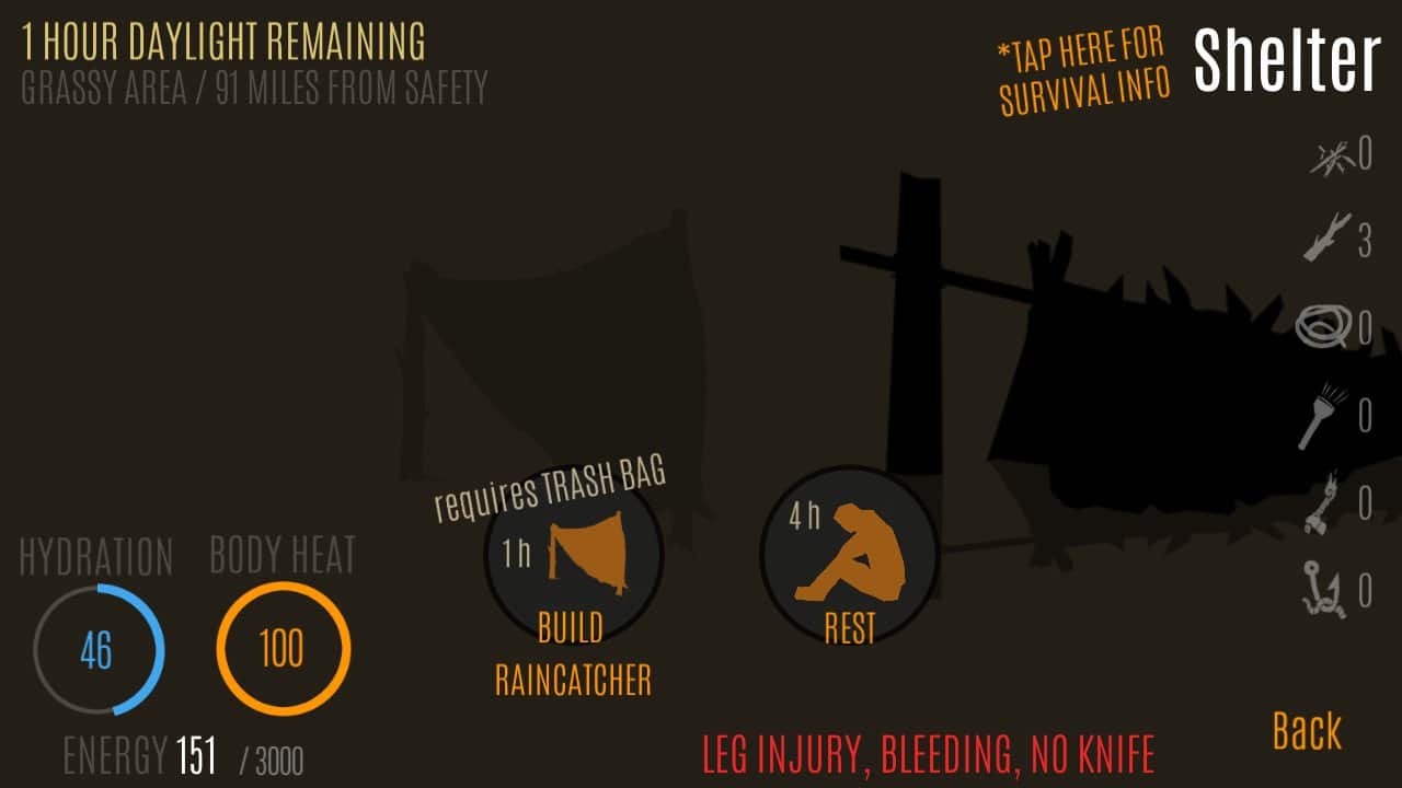 Survive - Wilderness survival - Захоплюючий квест, в якому вам потрібно буде вижити. Ця гра зроблена таким чином, що вижити, дуже не просто. Ви будете створювати притулок, щоб поспати, розводити багаття щоб не замерзнути. Так само вам треба добувати їжу, дерево, воду та багато іншого. Ви зможете переміщатися по різних частинах карти, з допомогою кнопки переходів. На все у вас буде йти певний час, а значить і енергія. Якщо спочатку ви зможете харчуватися тим що вам дали, то потім їжу доведеться добути. Нарубати дерев, спорудити вудку і вперед, на риболовлю. Так само залежно від погоди, вам потрібно буде міняти притулок, якщо хочете вижити. У грі дуже багато елементів, так що можете самі відправиться виживати, і переконатися що вона дуже цікава.