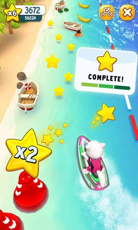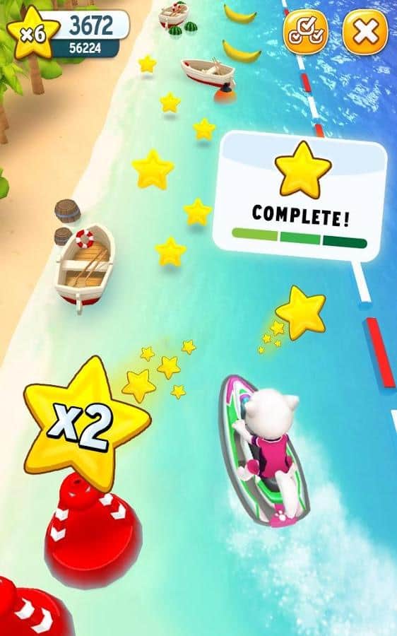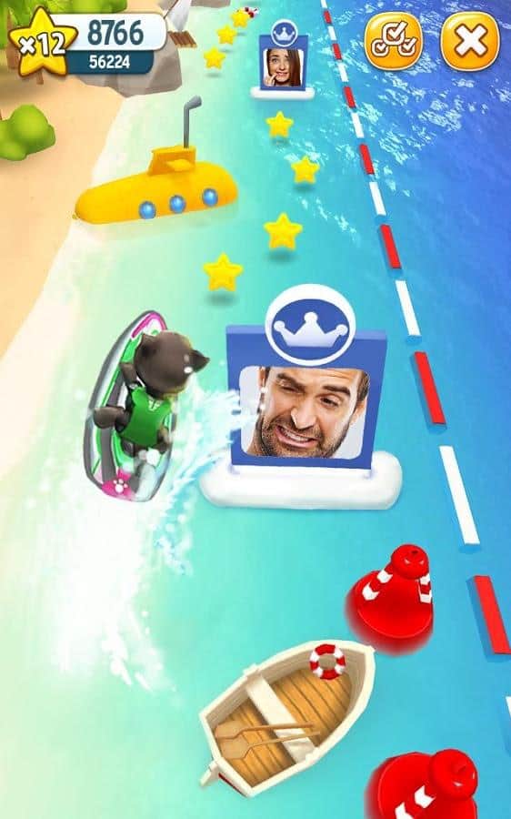 Talking Tom Jetski – динамічні гонки на швидкісних гідроциклах, в компанії мовця кота Тома і його подруги Анджели. Вибирайте за якого героя ви буде грати і почніть свою гонку. Сідайте за кермо гідроцикла і приготуйтеся виконувати небезпечні місії, долаючи різні перешкоди у вигляді буйків, каменів, бомб і човнів і при цьому, не забуваючи збирати корисні бонуси і зірки. Маневруйте між перешкодами і на величезній швидкості долайте траси. На зібрані зірки здобувайте нові гідроцикли і відкривайте нові захоплюючі місії. Змагайтеся з друзями і встановлюйте свої рекорди.