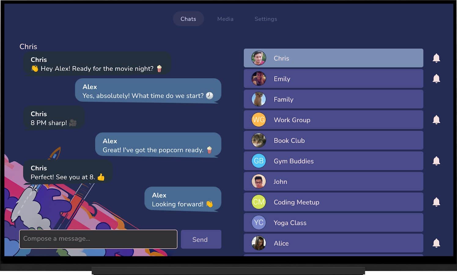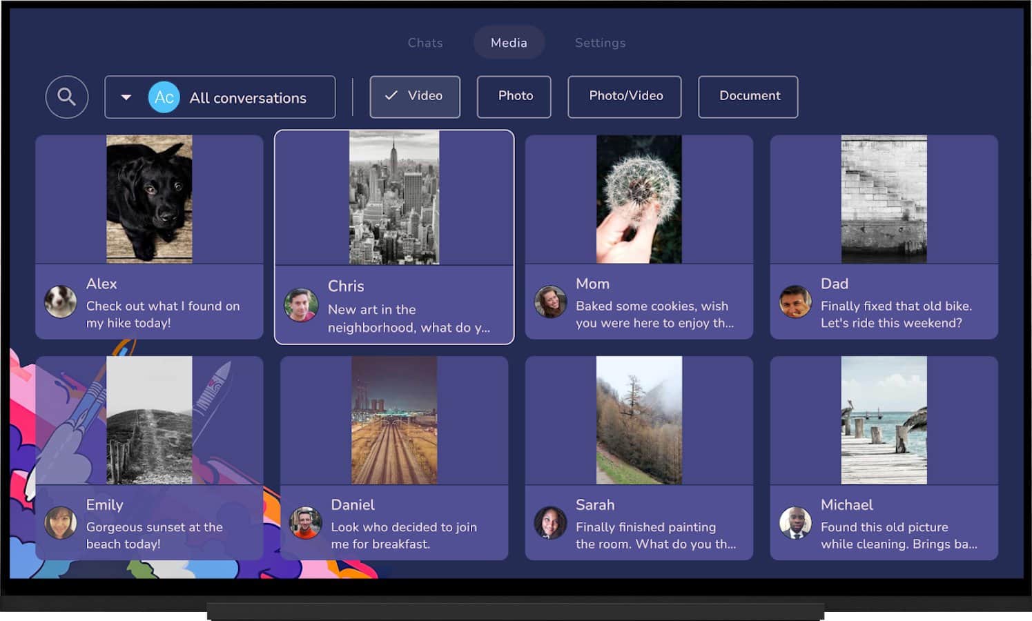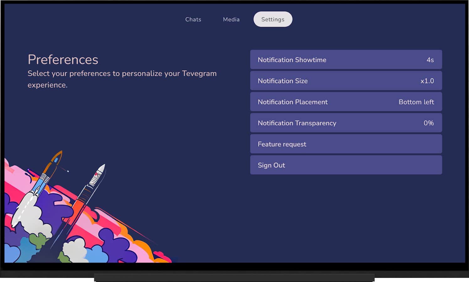Tevegram є неофіційним індивідуальним клієнтом Telegram, спеціально розробленим для використання на Android TV. Це пропонує можливість перегляду фільмів, спілкування з друзями, родиною та колегами прямо на телевізорі. Ви можете насолоджуватися фільмами, музикою або переглядом контенту під час розмов, а також отримувати сповіщення в реальному часі.