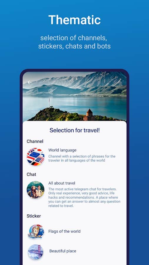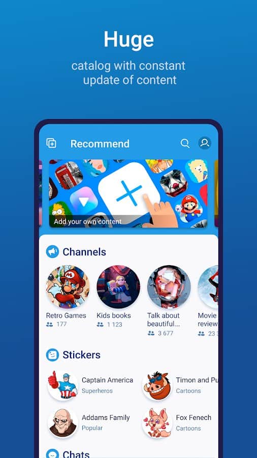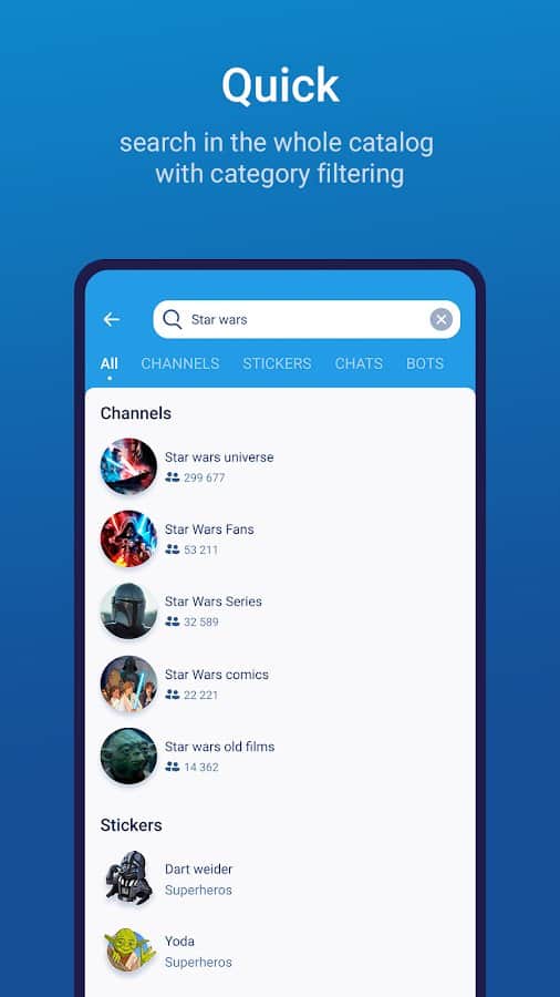 Додаток TgSurf включає в себе набір стікерів, каналів, ботів і чатів для популярного месенджера Telegram.