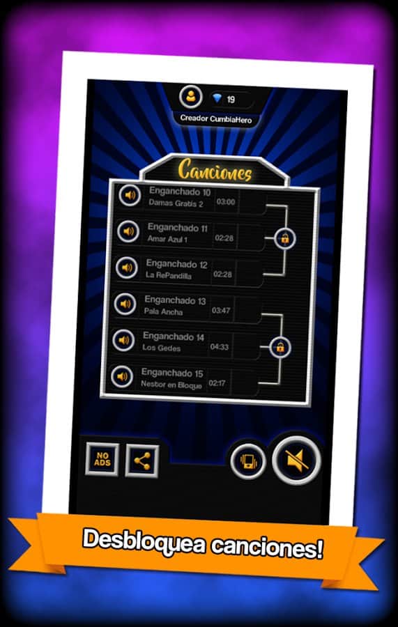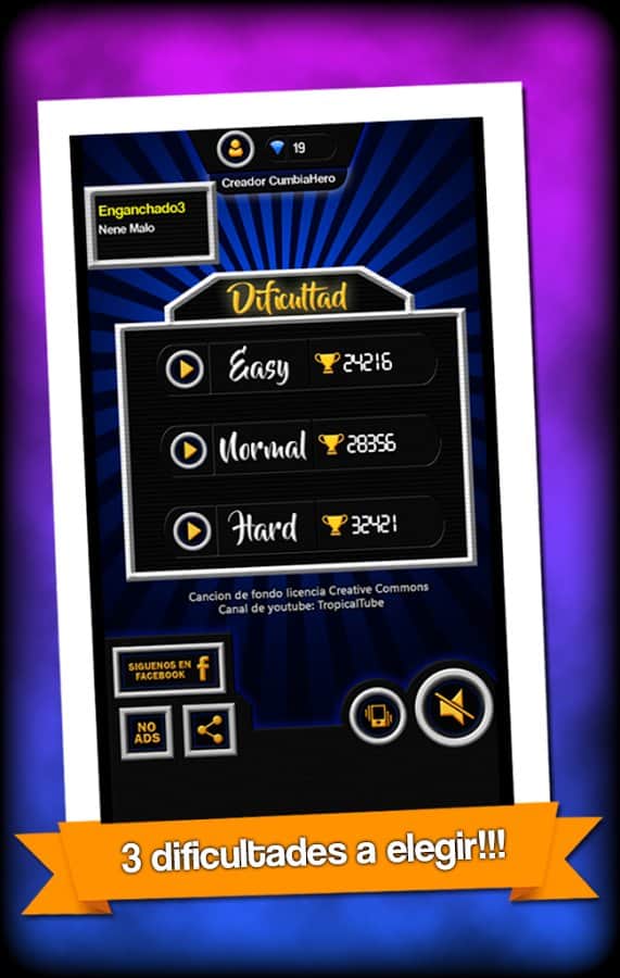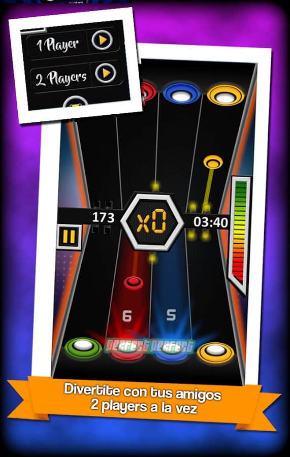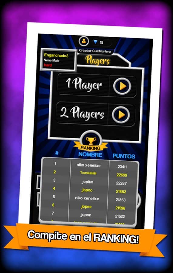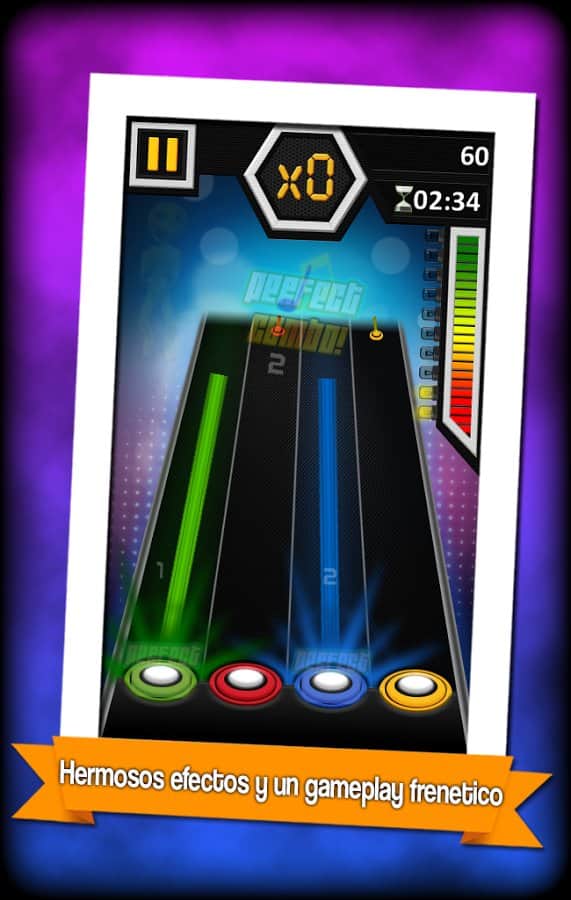 The Cumbia Hero – відмінна музична гра на андроїд, з різноманітними мелодіями. У цій грі перед вами виявиться чотири струни різного кольору, якими будуть рухатися ноти, вашим завданням буде вчасно натискати на спеціальні кнопки і отримувати мелодію. Як тільки нота певного кольору наблизитися до кнопки натискайте на неї. Не пропускайте ноти та отримуйте прекрасну музику. Ця гра перевірить на ділі вашу реакцію, грайте в неї і встановлюйте свій рівень складності. Грайте зі своїми друзями і набирайте достатню кількість очок, щоб відкрити нові мелодії. Гра порадує вас простим управлінням.