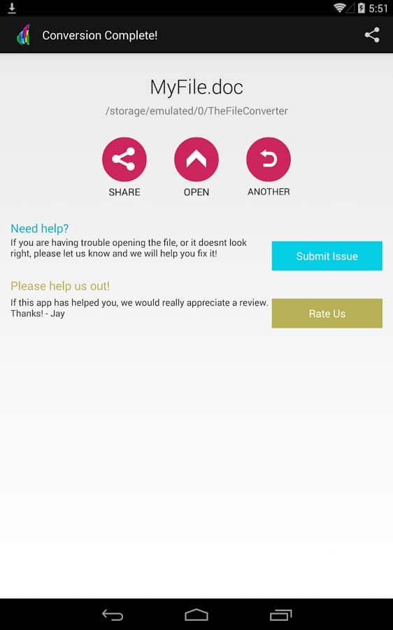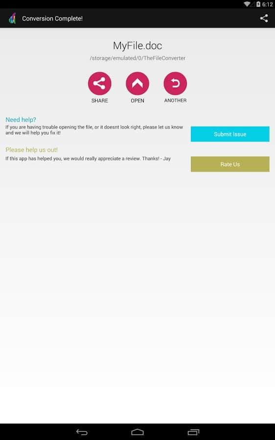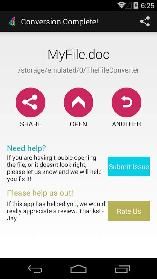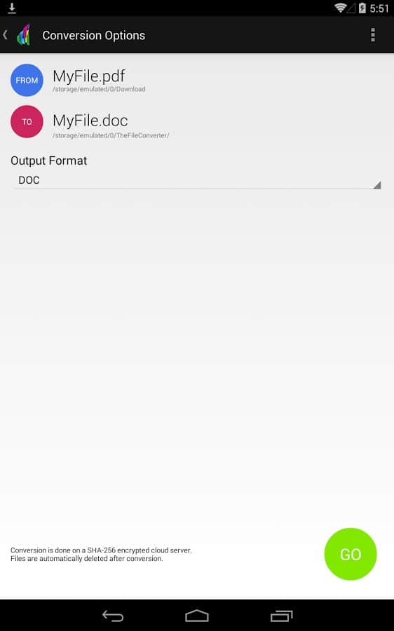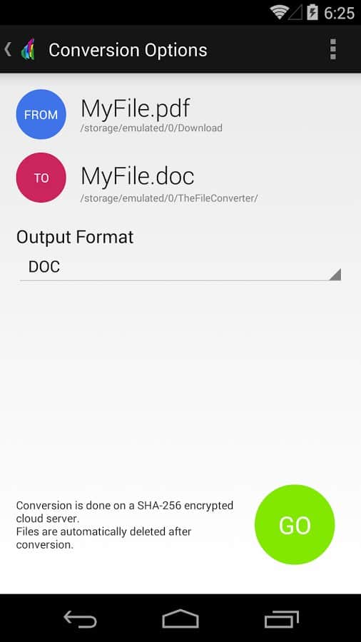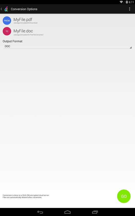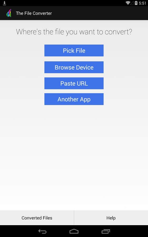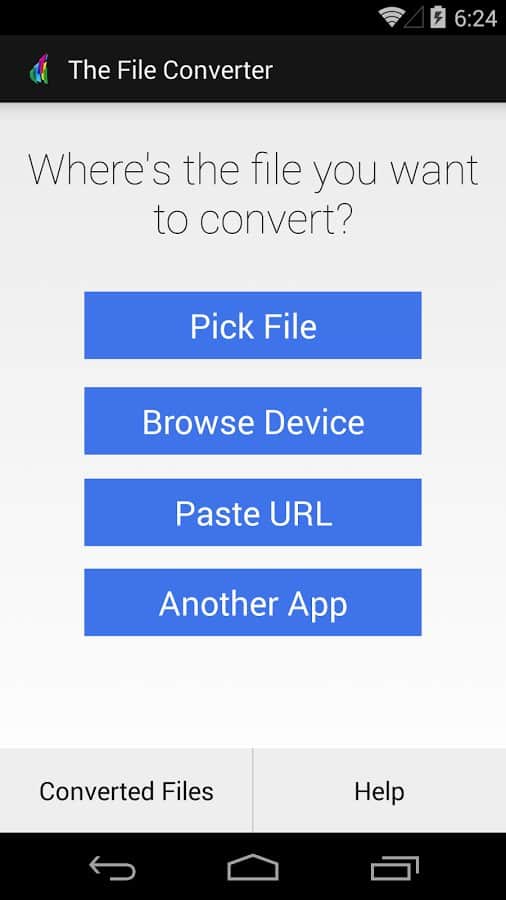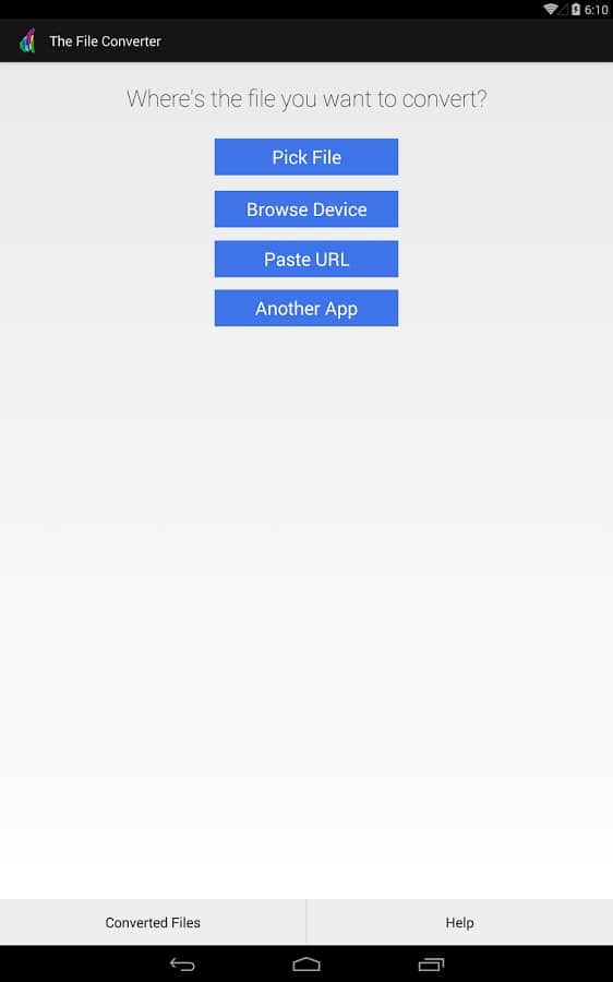 The File Converter для Андроїд. Конвертувати файли (відео, аудіо, зображення, документи та багато іншого) в будь-який формат стало ще простіше! Однак зверніть увагу, що для коректного функціонування програми необхідно постійне Wi-Fi з'єднання, тому що The File Converter працює через інтернет сервіс, а так само існує межа в 100 МБ для кожного файлу < br / & gt;
