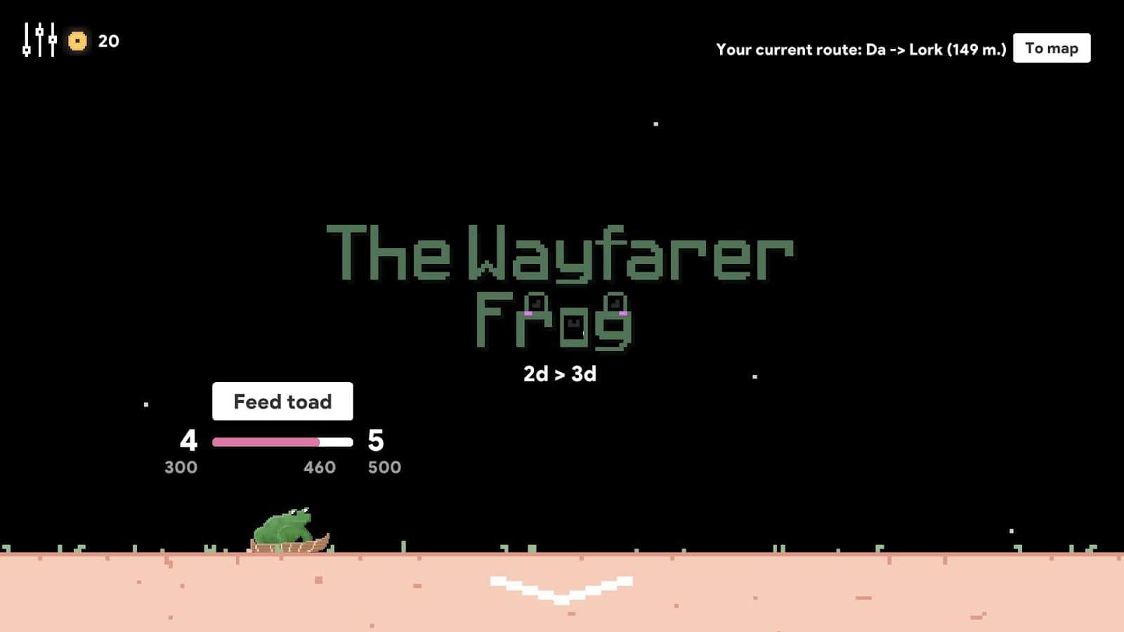The Wayfarer frog - пригоди жаби набирають значної швидкості! Сідайте в спеціальний човен і переміщайтеся по піску, витворяючи незвичайні трюки в повітрі після проходження крутих вершин. Різні біоми урізноманітнюють весь процес і зроблять його ще веселіше! Пройдіть захоплюючі випробування на карті, пролітаючи перешкоди у вигляді пасток, проходів, озер та інших речей. У вас також буде можливість зустріти голограму кота і робота, щоб поспілкуватися з ними і зрозуміти головну суть завдань. Не забувайте колекціонувати зовнішні види жаб!