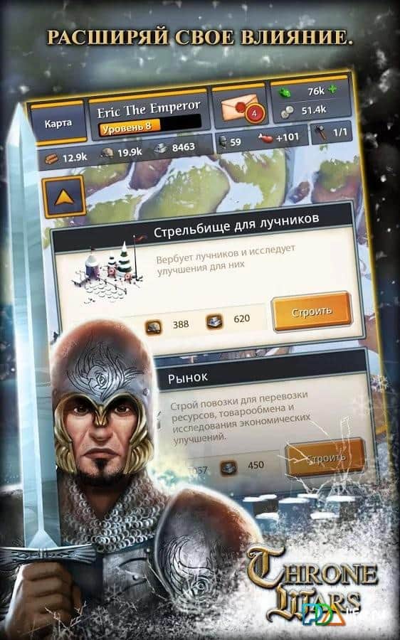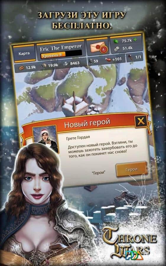 Throne Wars - Увлекательная игра на Андроид с хорошей графикой отличного качества. Эта замечательная стратегия увлечет вас захватывающим развитием событий. Вам предстоит начать свой путь к созданию непобедимого королевства с молодого регента. Проверьте свою отважность и хитрость, грабьте вражеские города, станьте героем поля боя, твердо идите к цели и узнаете кто станет королем. Вашими соперниками станут тысячи других игроков на огромной карте.