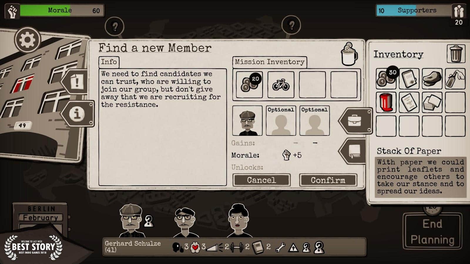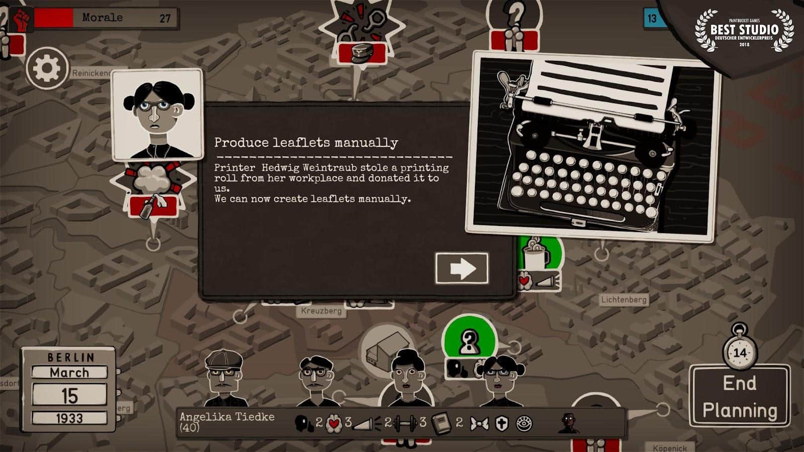 Through the Darkest of Times — гра в жанрі історичної стратегії на Android, яка присвячена рухові опору в найпохмуріший період історії і звичайному житті простих людей Третього рейху. Історична точність означає, що ваша невелика група не змінить результату війни — і не запобіжить всіх нацистських звірств. Однак ви зможете зробити все, щоб врятувати якомога більше життів і протистояти системі при будь-якій можливості. 1933 рік, Берлін. Ви лідер невеликої групи опору, в яку входять звичайні люди — євреї і католики, комуністи і патріоти, які не можуть закрити очі на події. Ваше завдання — наносити режиму крихітні удари: розкидати листівки, щоб розповісти людям, що нацисти творять насправді; писати послання на стінах; влаштовувати диверсії; добувати інформацію і набирати нових соратників. І при цьому не видавати себе: якщо режим дізнається про вашу групу, життя кожного її учасника опиниться в небезпеці.