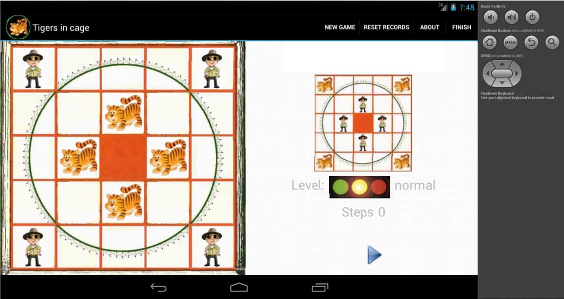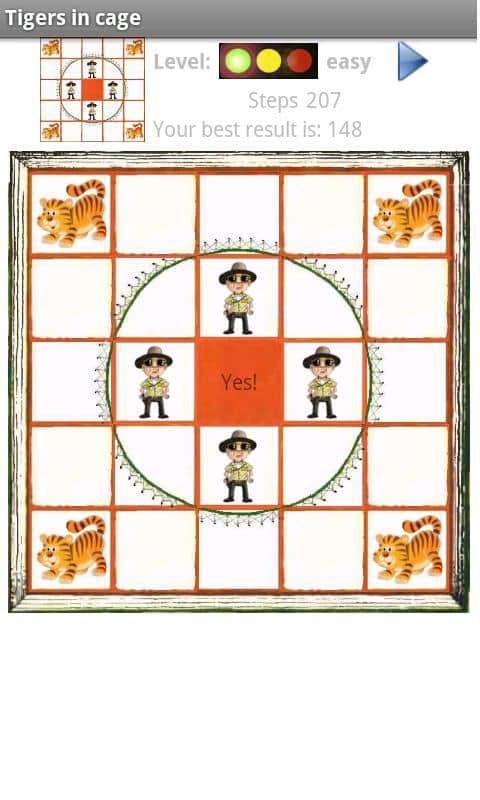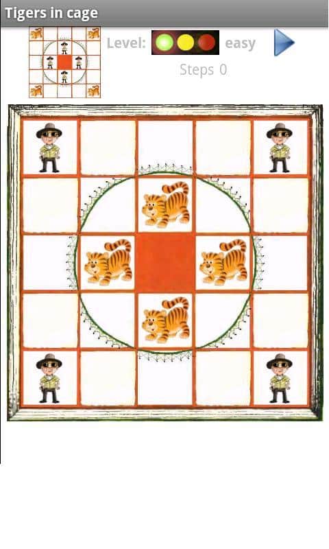 Освободите тигров из клетки! Бедным животным там совсем не нравится, но их никто не спрашивает, да еще и охрану приставили! Ваша задача, изменить местоположение тигров и охранников в поле 5*5. В центре поля пустая ячейка, на 4х сидят тигры вокруг пустой ячейки, еще на 4х охранники по углам, остальное - куски решетки. Передвигая плиточки, нужно освободить тигров, а охранников запереть в клетке! Игра имеет 3 уровня сложности: легкий, нормальный, трудный). Игра весьма напоминает обычные "пятнашки", только чуть больше размером и с сюжетом вместо цифр. Тренируйте память, логику и скорость вместе с таким типом игры для андроид Тигры в клетке.