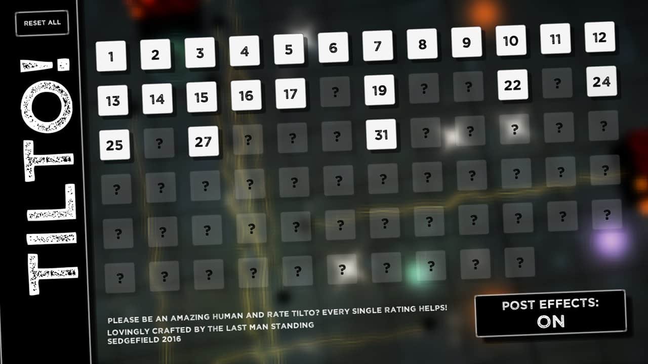 Tilto! - захоплююча і динамічна аркада з елементами фізики. Головне ваше завдання на кожному з рівнів це провести кульку від синього до порталу зеленому, проте звучить це набагато простіше, ніж виявляється на ділі. Якщо на початкових рівнях локації виконані у вигляді невеликих кімнат, в яких зустрічаються пастки, портали, телепорти і проходження такого рівня праці не становить, то в міру просування до більш високим рівня складність помітно зростає, адже локації помітно ускладнюватися, а часом представляють з себе справжні лабіринти. У цілому Tilto! відмінний аркадний проект, який зажадає від вас не тільки швидкості реакції і вправності, а й кмітливості, що в свою чергу допоможе вам розім'яти не тільки пальці, але й мізки.