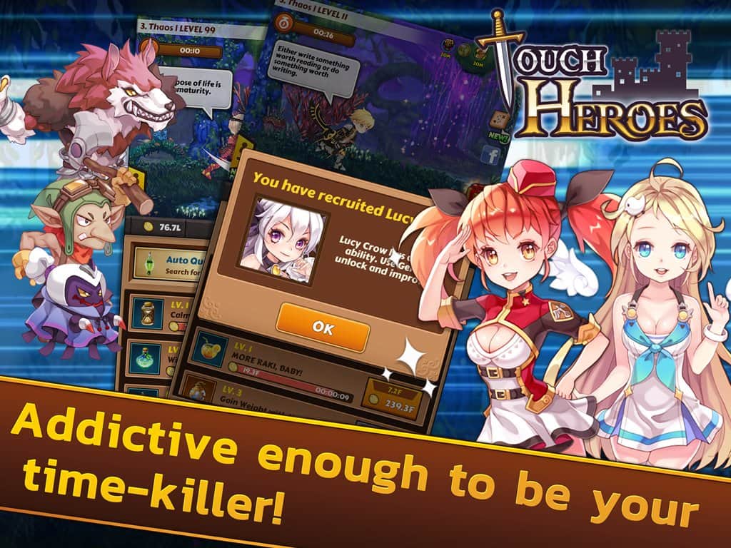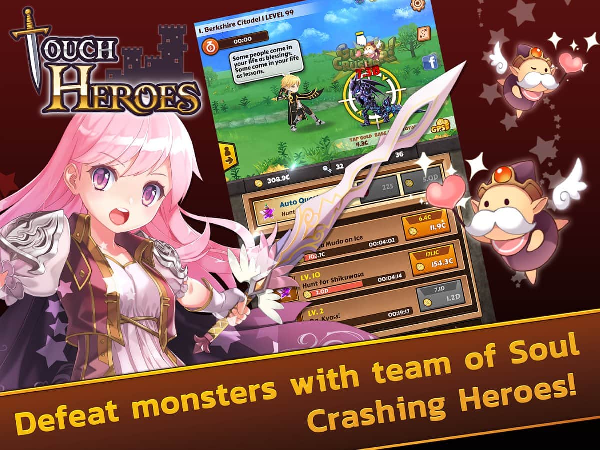 Touch Heroes: Soul Crash – пригодницька клікер гра, в яку можна грати довгий час. Легендарний майстер меча Люсі Кроу тільки що отримала завдання врятувати світ, і в даний час разом зі своїми друзями відправляється мстити. Клікайте і спостерігайте, як ваші герої приголомшливо наносять атаки на своїх ворогів. Більше кліків більше перемог! Заробляйте більше золотих монет і ви зможете швидше проходити рівні. Найміть героїв і розблокувати спеціальні здібності, модернізуйте зброю для кращих атак завоювати замки, заздалегідь через підлоги, щоб довести свою силу. Кожні 30 рівнів ви будете отримувати подарункові коробки.
