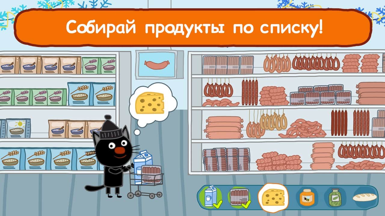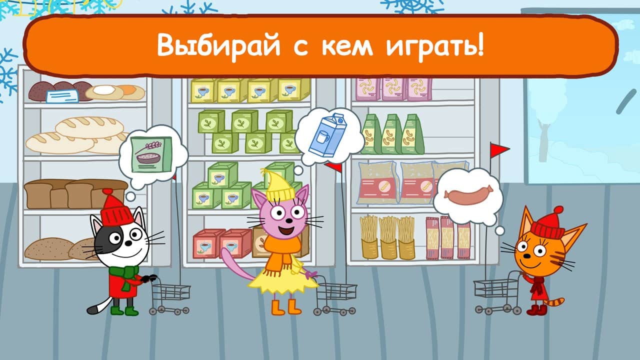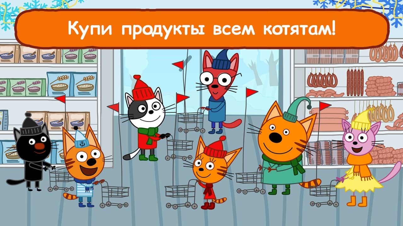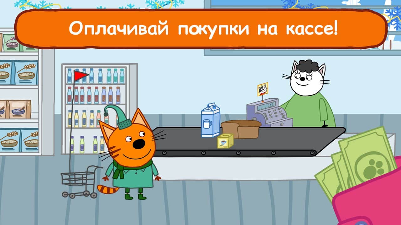 Головні персонажі гри - кошенята з улюбленого багатьма дітьми мультфільму "Три кота". Батьки видали кошенятам довгий список покупок і послали в магазин одних. Починаючи гру, дитині потрібно потрібно вибрати одного з кошенят, взяти візок і відправитися на пошуки необхідних товарів. Потрібно бути уважним, щоб не прихопити з полиць зайві речі, а після того як всі продукти із списку опиняться у візку, пора перейти до каси і правильно розплатитися за рахунком. Розвиваюча играпоможет дитині запам'ятати цифри і натренувати пам'ять. Поступово, по мірі того, як малюк буде переходити з рівня на рівень, складність завдань почне підвищуватися.