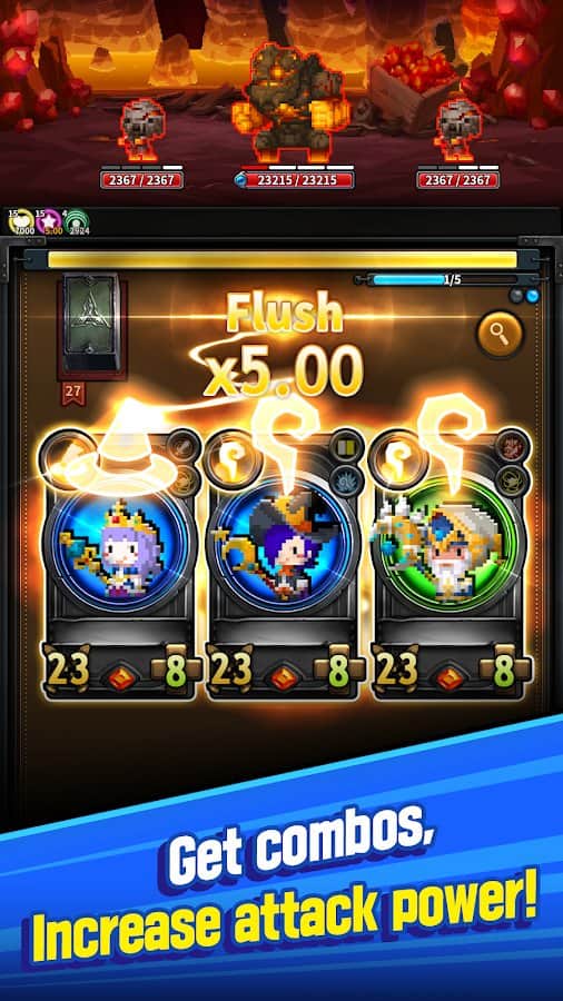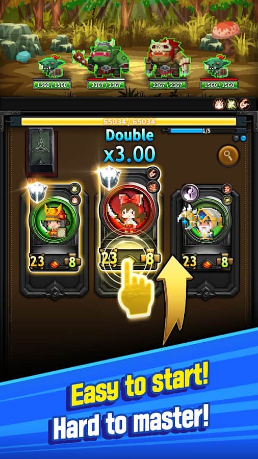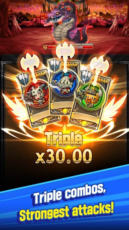 TripleFantasy – карткова гра на андроїд, де ви будете рятувати світ від руйнування. У цій грі ви опинитеся у фантастичний світ де править озброєння і вміння. Ви єдиний хто зголосився захищати королівство від жахливих монстрів. Візьміть під свій контроль відважного воїна і комбінуйте між собою атаки і наносите руйнівні удари противникам. Застосовуйте на ділі свої вміння і розробляйте свою стратегію ведення бою. Гра порадує гравців ретро дизайном, численними піксельними персонажами, широким вибором карт і численними навичками.