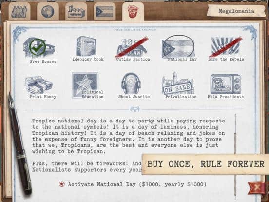 Tropico – захоплююча гра, де ви будете виступати в ролі президента невеликого Карибського острова. Ви є новообраним президентом карибського острова Тропико якому терміново потрібна модернізація. Візьміть під свій контроль острів і почніть його поліпшення з доріг, будівель, а також не забувайте про військові і торговельні відносини з іншими країнами. Перетворіть свою країну в тропічний рай для туристів і створюйте численні готелі та курорти. Ваші можливості в цій грі будуть безмежні, і ви можете стати мудрим і успішним лідером.