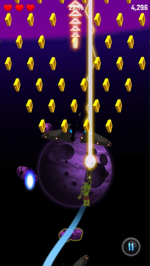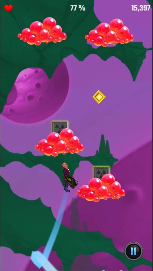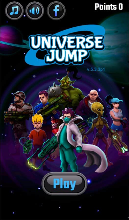 Universe Jump – керування рухом відважного героя і врятуйте планету від захоплення інопланетними монстрами. Ведіть свого героя вперед, піднімаючи його все вище стрибаючи з однієї платформи на іншу і знищуючи всіх ворогів постають у нього на шляху. Покажіть на ділі свою відмінну реакцію і швидкість пальців, стрибаючи з однієї платформи на іншу. По дорозі не забувайте збирати золоті монетки, які допоможуть вам отримати нову зброю і відкрити нових забавних героїв таких як орк, прибулець та інші. На руці вашого героя буде потужний лазер, за допомогою якого ви зможете знищувати всіх злісних ворогів і босів. Переміщайтеся по численних і різноманітних рівнів і знищити всіх ворогів.
