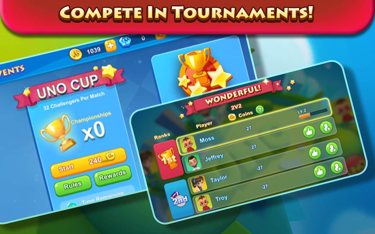UNO! – захоплююча настільна ігор на андроїд, тепер змінилася до невпізнання. У цій грі вас чекають нові правила, турніри, пригоди і багато іншого. Грайте в цю гру в будь-який вільний час і весело проводите час. Ця гра відмінно підійде як для досвідчених гравців, так і для новачків. Ця сучасна карткова гра створена для всієї родини граючи в яку ви будете отримувати нагороди і бонуси.