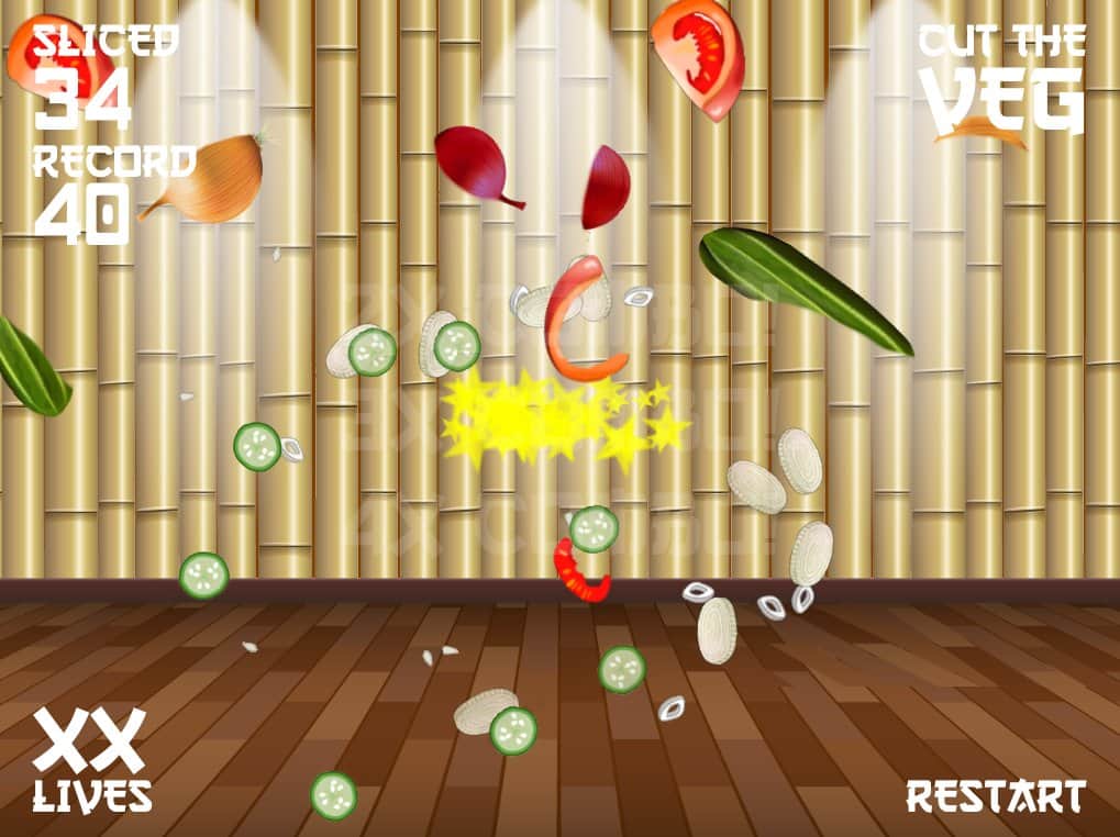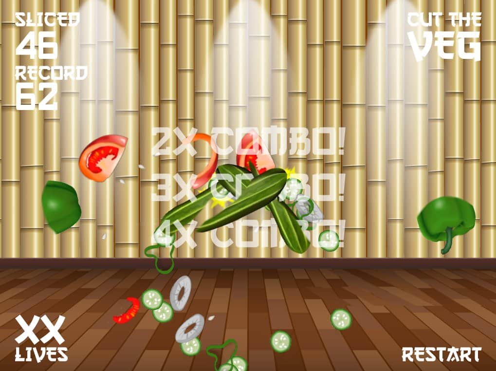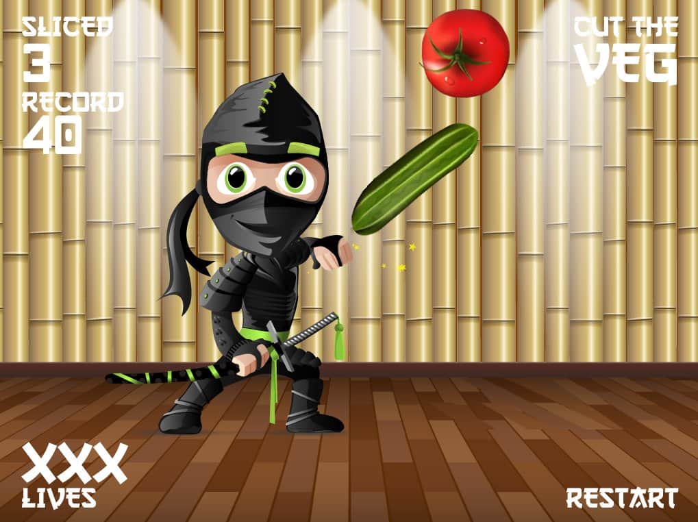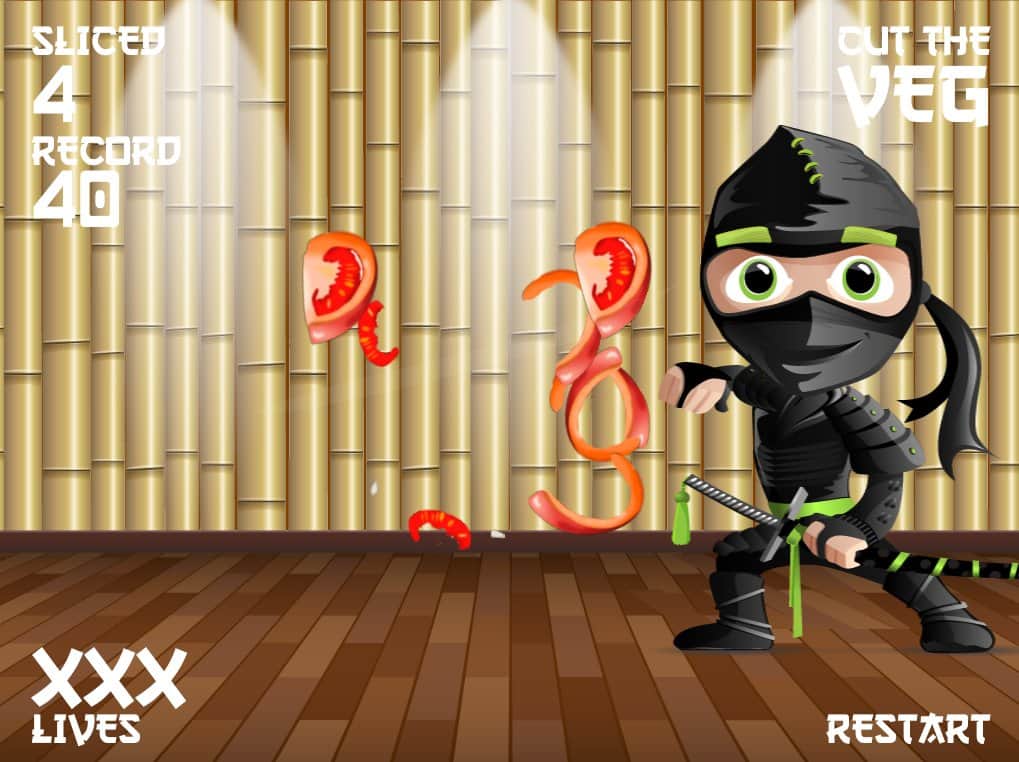 Veg ninja – нарізайте фрукти і овочі на дрібні шматочки, використовуючи для цього свій меч. Динамічна гра на андроїд, де вам належить перетворити свій екран телефону або планшета в дошку для нарізування овочів і фруктів. Беріть свій меч і одним точним рухом нарізайте на дрібні шматочки соковиті плоди. Створіть нескінченний феєрверк з шматочків фруктів і овочів і уникайте при цьому різні пастки у вигляді бомб. Гра підійде для всіх віків і сподобається абсолютно всім. Грайте в цю гру в будь-який вільний час і насолоджуйтеся приємною графікою і відмінним музичним супроводом.