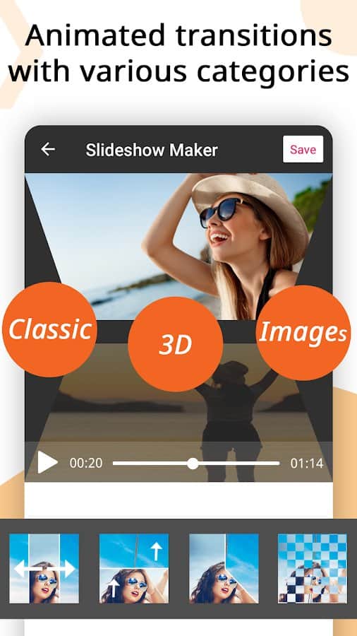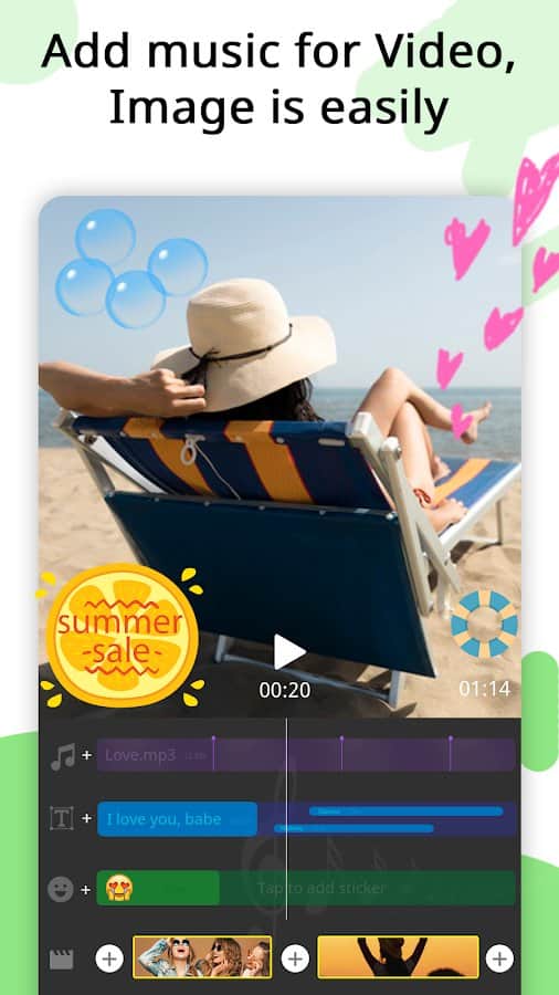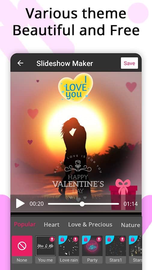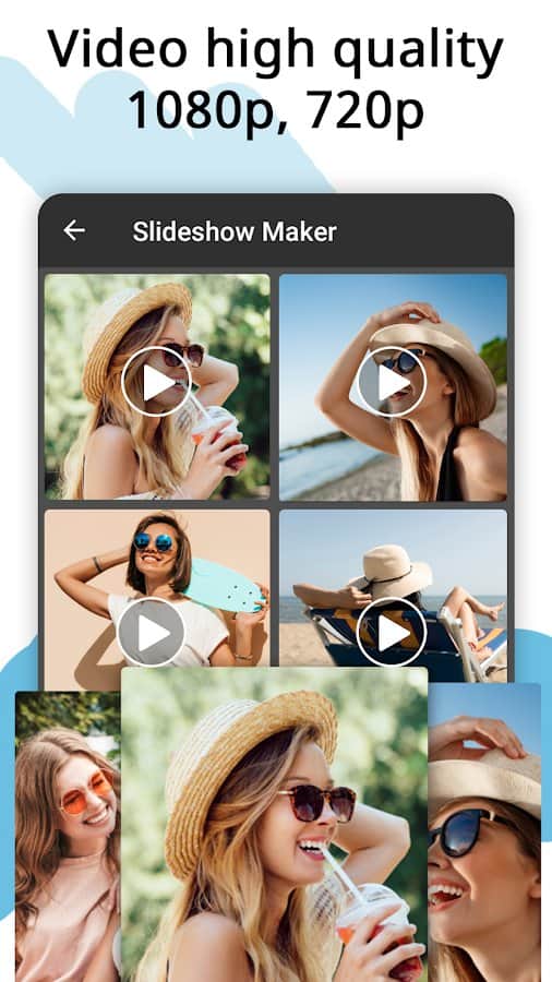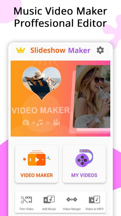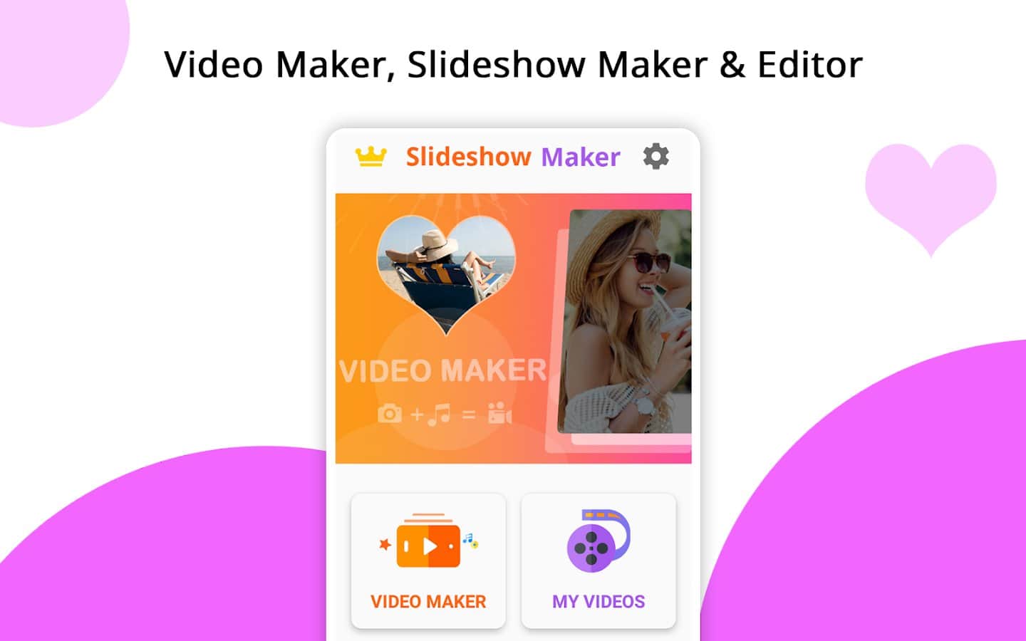 Додаток Video Maker, Video Slideshow Maker допоможе вам легко і швидко створювати відеоролики, фотоколаж або музичні кліпи, а також редагувати їх. Ви зможете створювати відео з фотографій в кількості до 100 штук, виконувати обрізку фото і відео, об'єднувати кілька роликів в один, додавати аудіо і т. д. Створюйте унікальні сюжети, історії й публікуйте їх в популярні соцмережі, діліться з рідними та близькими в месенджерах. Слайд-шоу з фотографій також може здивувати друзів і стати яскравим елементом спогадів з життя. Вибирайте різні теми (люди, любов, стосунки, дружба), додавайте ефекти переходу, міняйте час і швидкість показу презентації, колір, стиль, розмір, шрифт, тінь і інші фільтри, конвертуйте відео і аудіо, зберегти у високій якості.