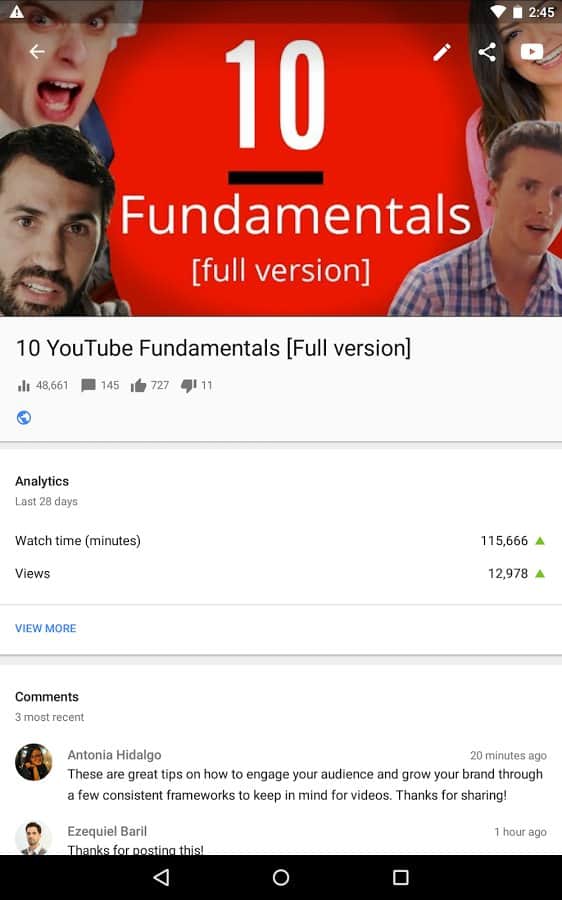 Відеостудія YouTube & amp; ndash; додаток для швидкого доступу і управління своїм каналом YouTube з мобільного пристрою. Завантаживши і встановивши цей додаток на свій девайс, ви будете отримувати оповіщення, зможете переглядати статистику і відповідати на коментарі. Все просто і зручно, викачуємо!