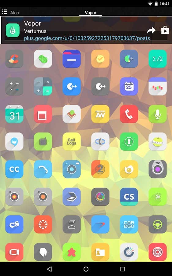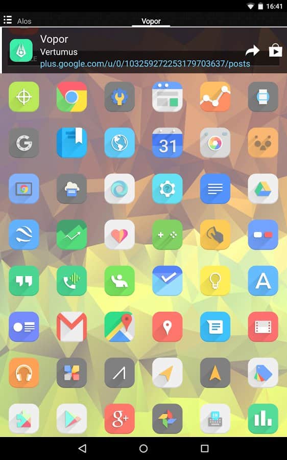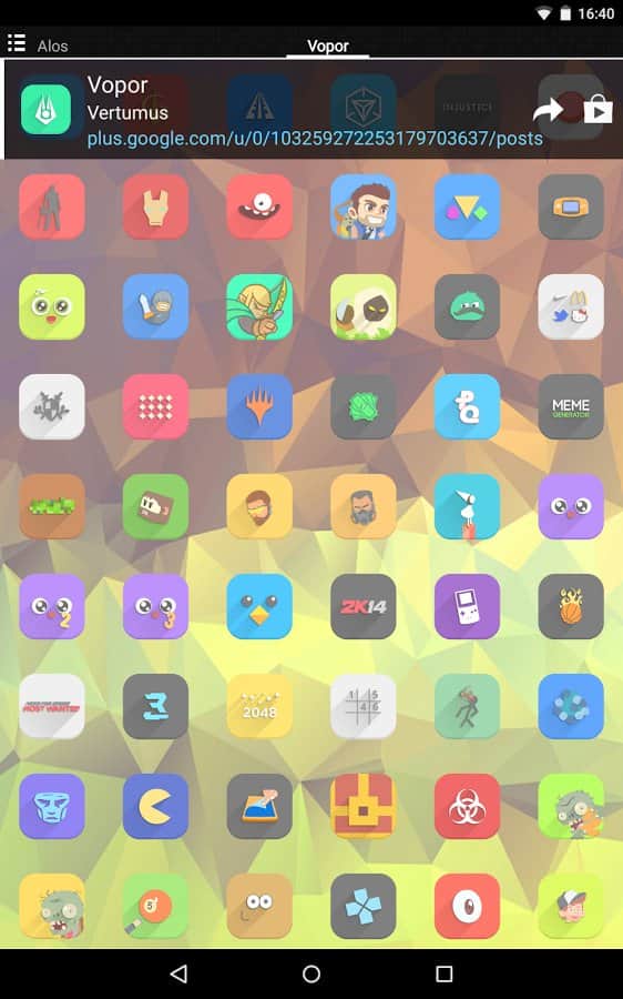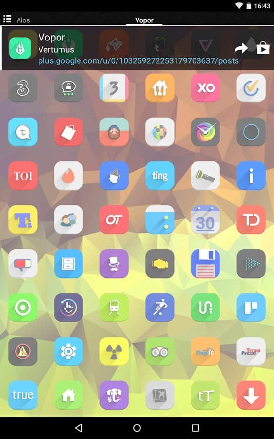 Vopor - Icon Pack - відмінний збірник для вашого робочого столу, величезний вибір барвистих іконок і шпалер які оновлюються щодня. Всі вони мають відмінну деталізацію і якість промальовування, вибери те, що тобі потрібно, з безлічі, будь то щось яскраве, або ж навпаки щось непримітне. Кількість іконок в цьому додатку, просто вражає, і якщо ви вважаєте себе витривалим - спробуйте перегляньте їх усі!