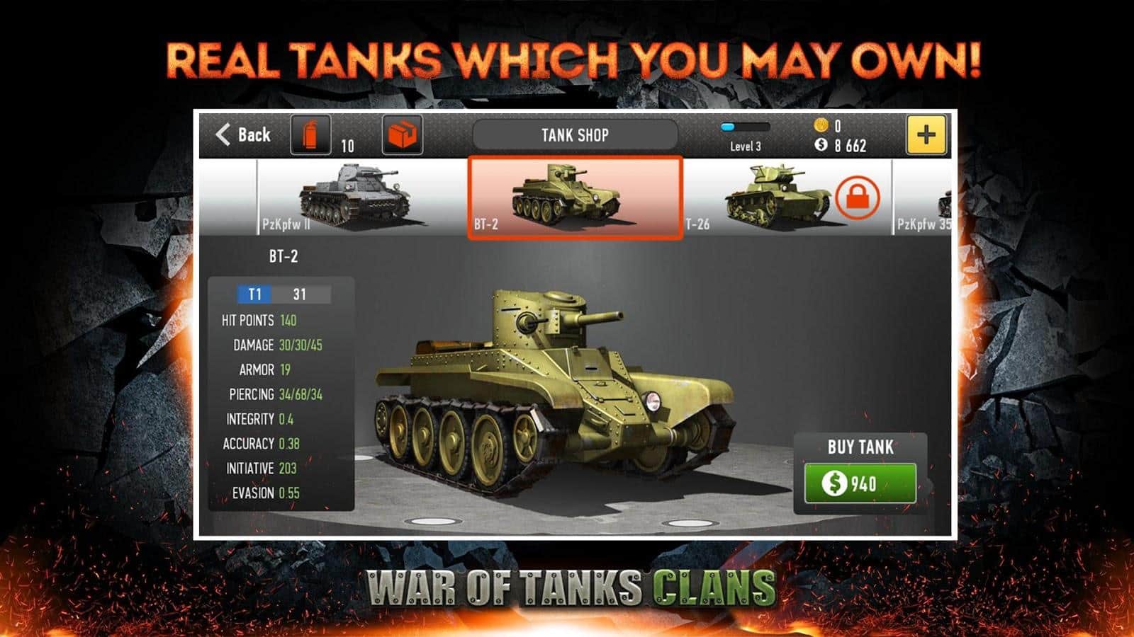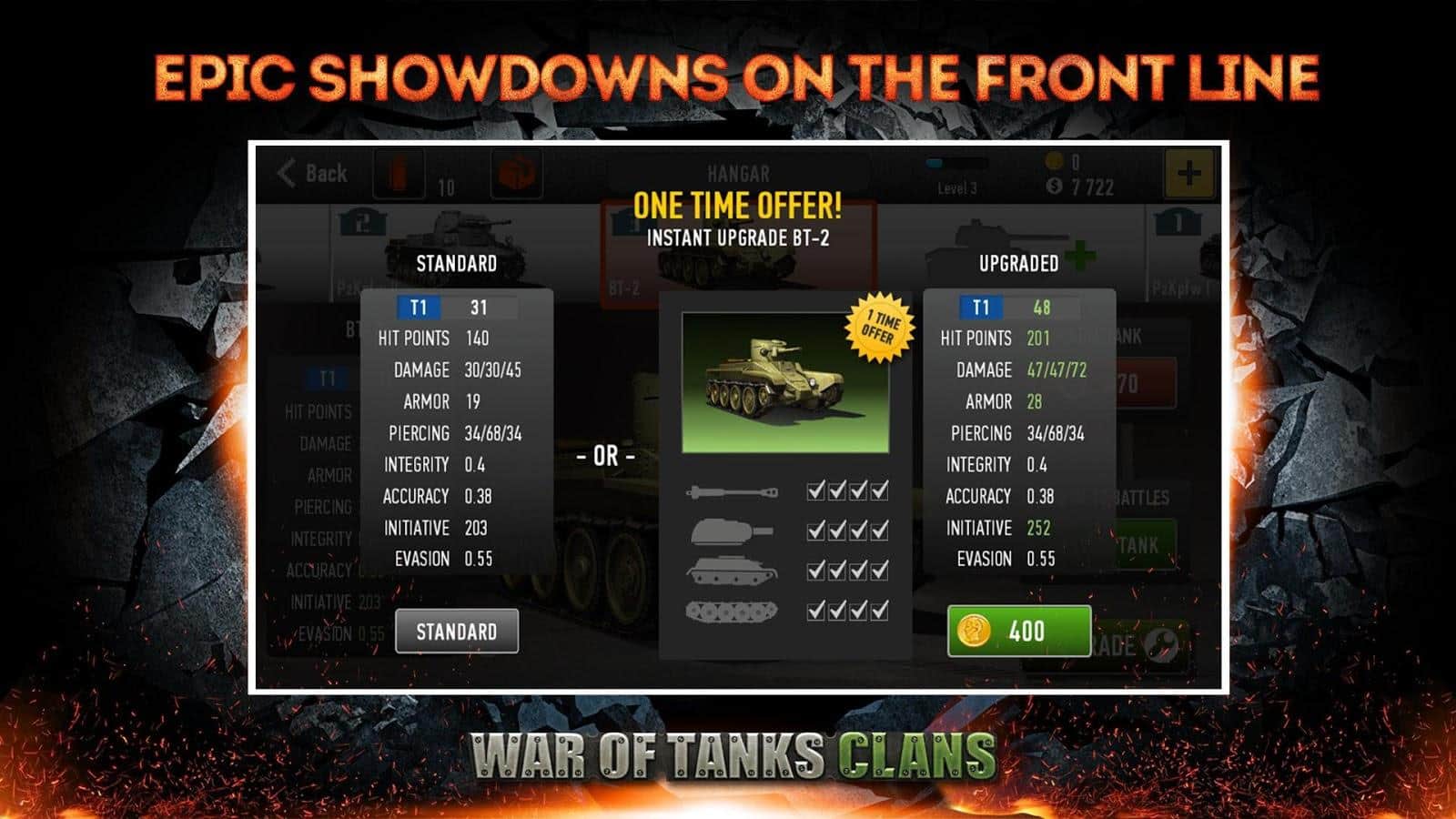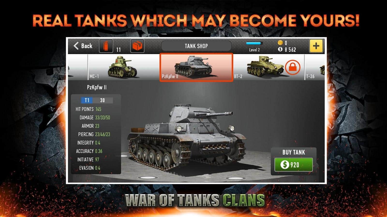 War of Tanks: Clans - танкова стратегія на android, часів Другої світової війни. У цій грі ви візьмете під своє командування величезні танки і поведе їх до перемоги. Вас чекає 5 режимів гри один з яких є онлайн, де ви зможете зібрати компанію з восьми танків і направити всю цю потужність на ворога. Беріть участь в шести рейдах поспіль і отримуйте за це унікальні креслення танків, які допоможуть вам зібрати універсальні танки. Боріться в смертельних боях, заробляйте окуляри і відкривайте для себе нові танки і легендарний важкий Черчіль.