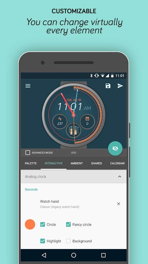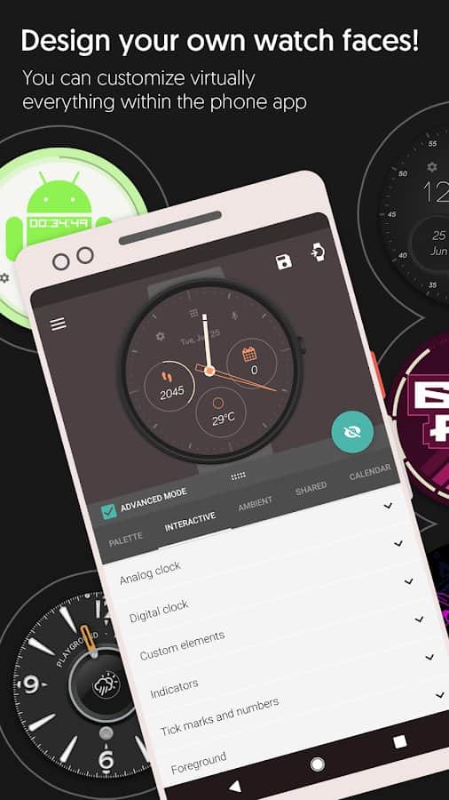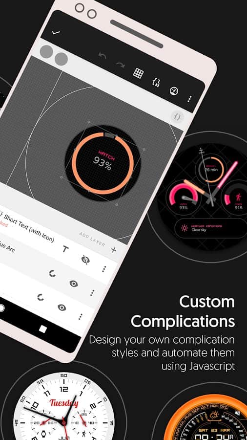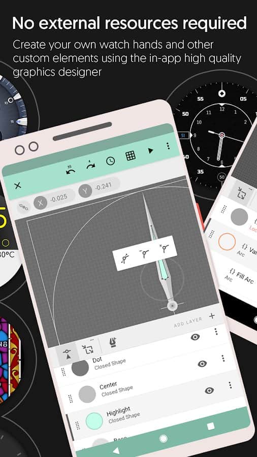 за допомогою програми Watch Face Designer ви зможете створювати власні циферблати для розумних годин Wear OS за допомогою вбудованого конструктора і користуватися швидкою програмою запуску. Додавайте будь-яке зображення, текст, міняйте дизайн стрілок і не тільки. Настроюється панель дозволяє за допомогою декількох торкань поміняти важливі параметри годин і використовувати їх для фітнесу, календаря, перегляду погоди і т.д. ускладнені деталі годин дозволять вам створити власний стиль з підтримкою векторної графіки. Хмарна бібліотека циферблатів дозволить вам вибрати потрібний макет і експериментувати з ним до створення ідеального образу.