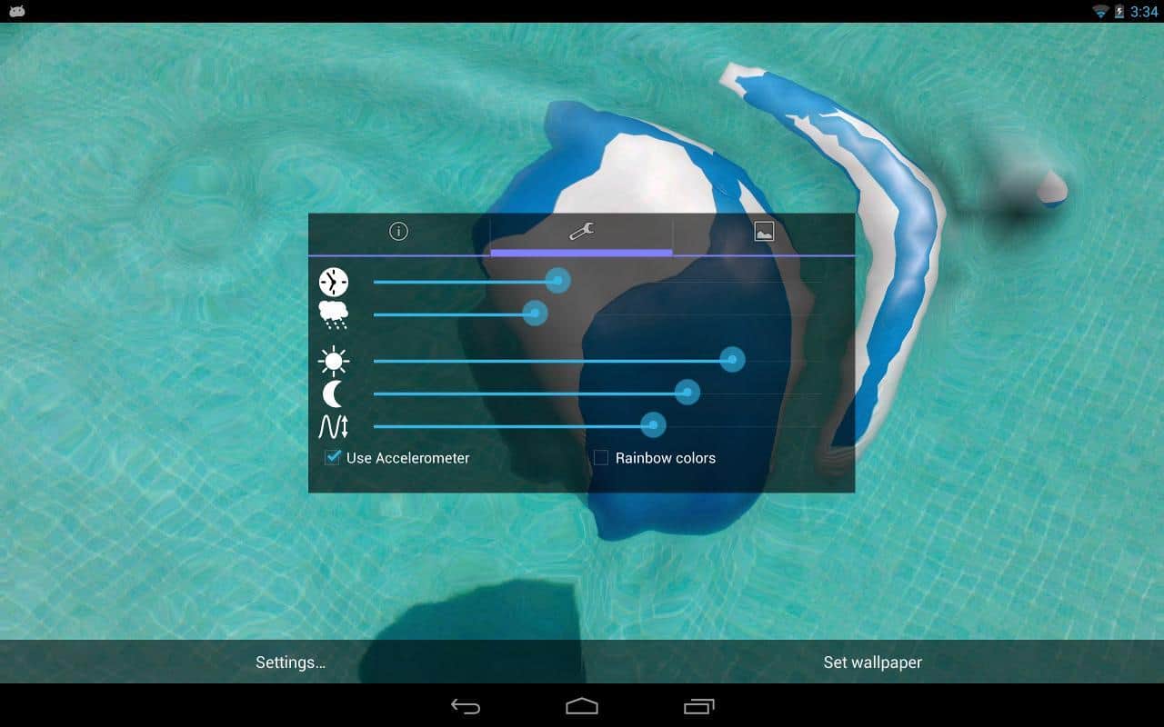 Water Touch Live Wallpaper – живые обои для андроид устройств, представляющие собой интерактивную поверхность воды. В настройках вы можете установить необходимую скорость-вязкость воды, блики, тени, устроить дождик и выбрать один из 6 предложенных фонов или установить собственный, а так же многое другое. Приятного!