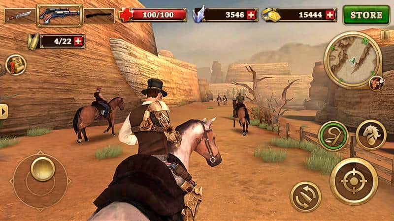 West Gunfighter – захоплюючий екшен на андроїд, де ви перенесетеся у світ Дикого Заходу. У цій грі ви будете виступати в ролі ковбоя, самотнього, безстрашного і небезпечного. Візьміть в руки револьвер і дослідіть різноманітні локації, шукаючи собі розвагу до душі. У грі ви зможете виконувати різні завдання і місії ви навіть зможете вибрати собі роль, в грі стаючи злочинцем грабуючи і вбиваючи всіх кругом чи шляхетним лицарем рятуючи невинних людей і знищуючи злочинців. Купуйте різні ковбойські костюми для героя, грайте в блэкджэк або беріть участь в дуелях.