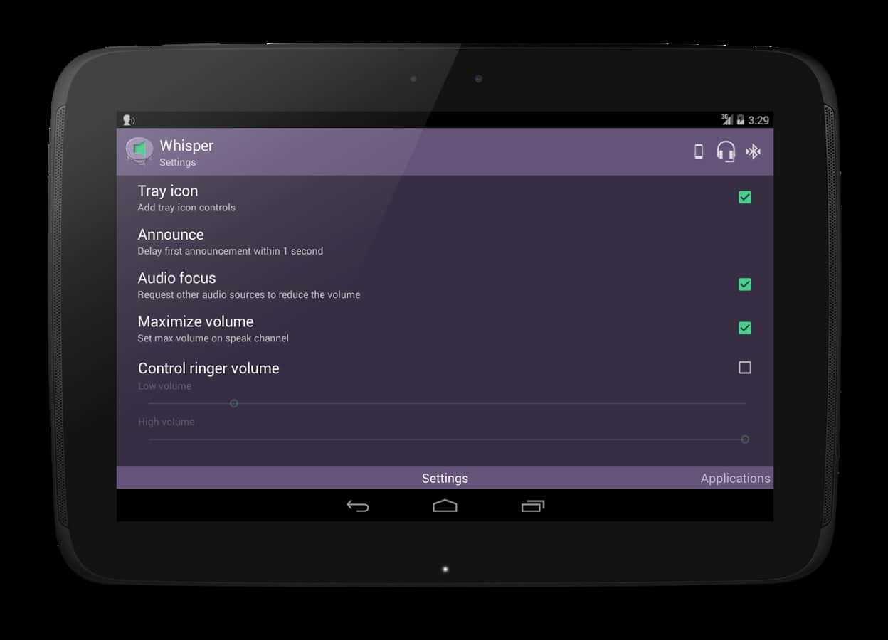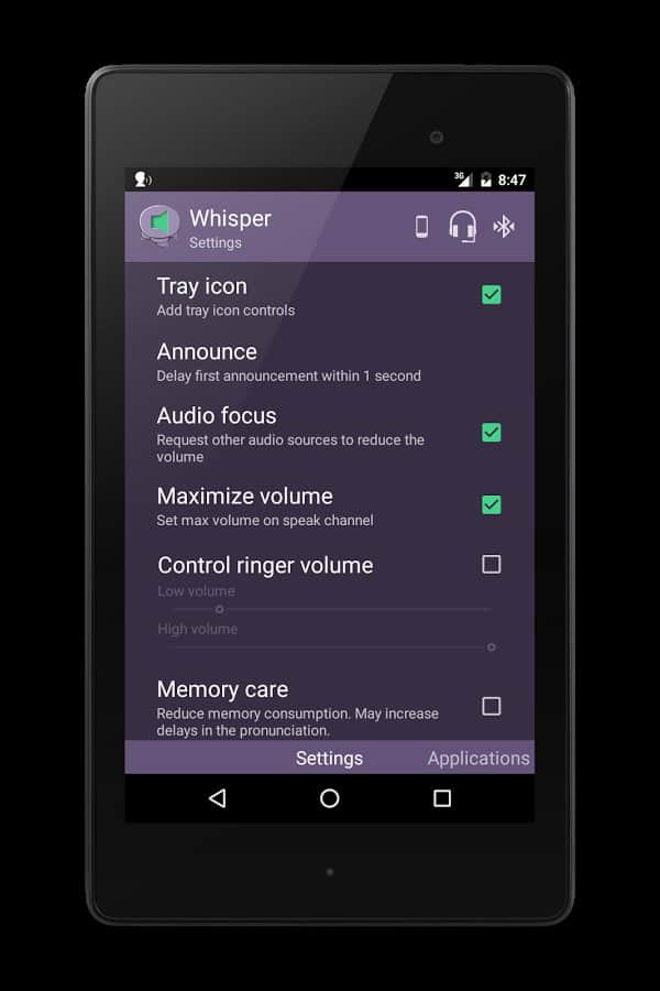 Whisper – хорошая и удобная программа для андроид с простым и понятным интерфейсом. Whisper приятным голосом озвучит имя звонящего вам абонента. А при первом запуске проанализирует контакты и скачает на SD-карту все необходимые звуковые сигналы для дальнейшей работы. Стоит отметить, что возможность ввода дополнительных звуков напрямую зависит от программных и аппаратных особенностей вашего устройства.