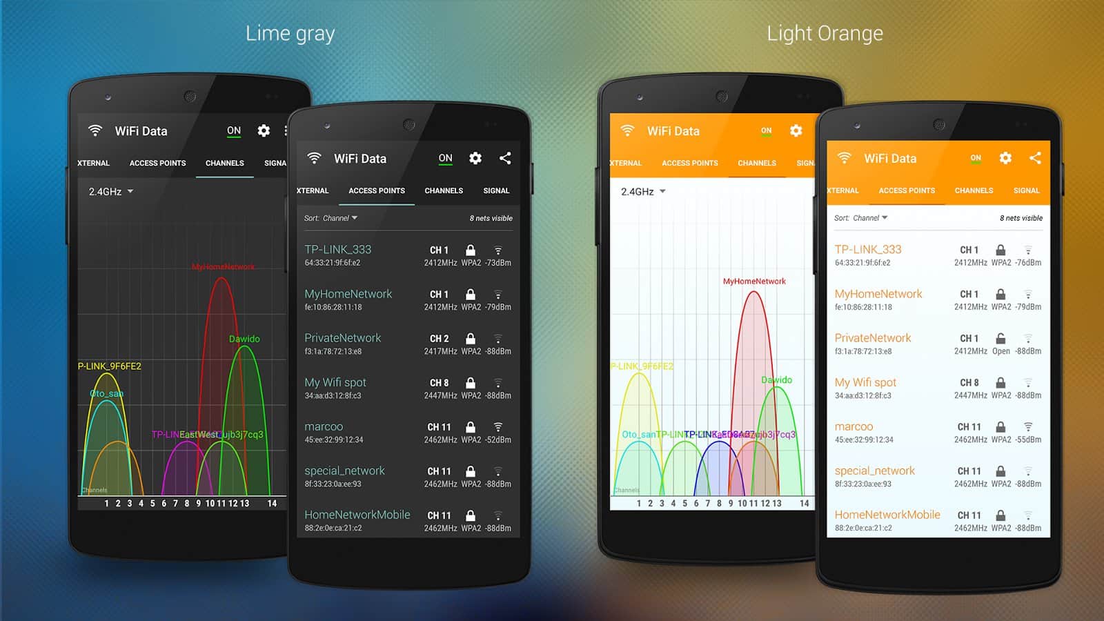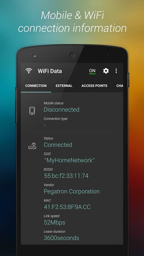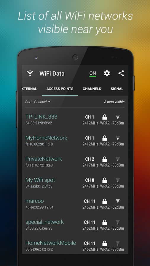 WiFi Data – программа для андроид устройств от разработчика Propane Apps, предоставляющая все данные о вашем Wi-Fi соединении, благодаря проведению диагностики сигнала WiFi и проверяя состояние устройства с вашим приложением. Для данного действия вам предлагаются 4 вкладки, каждая из которых несет свою информацию: