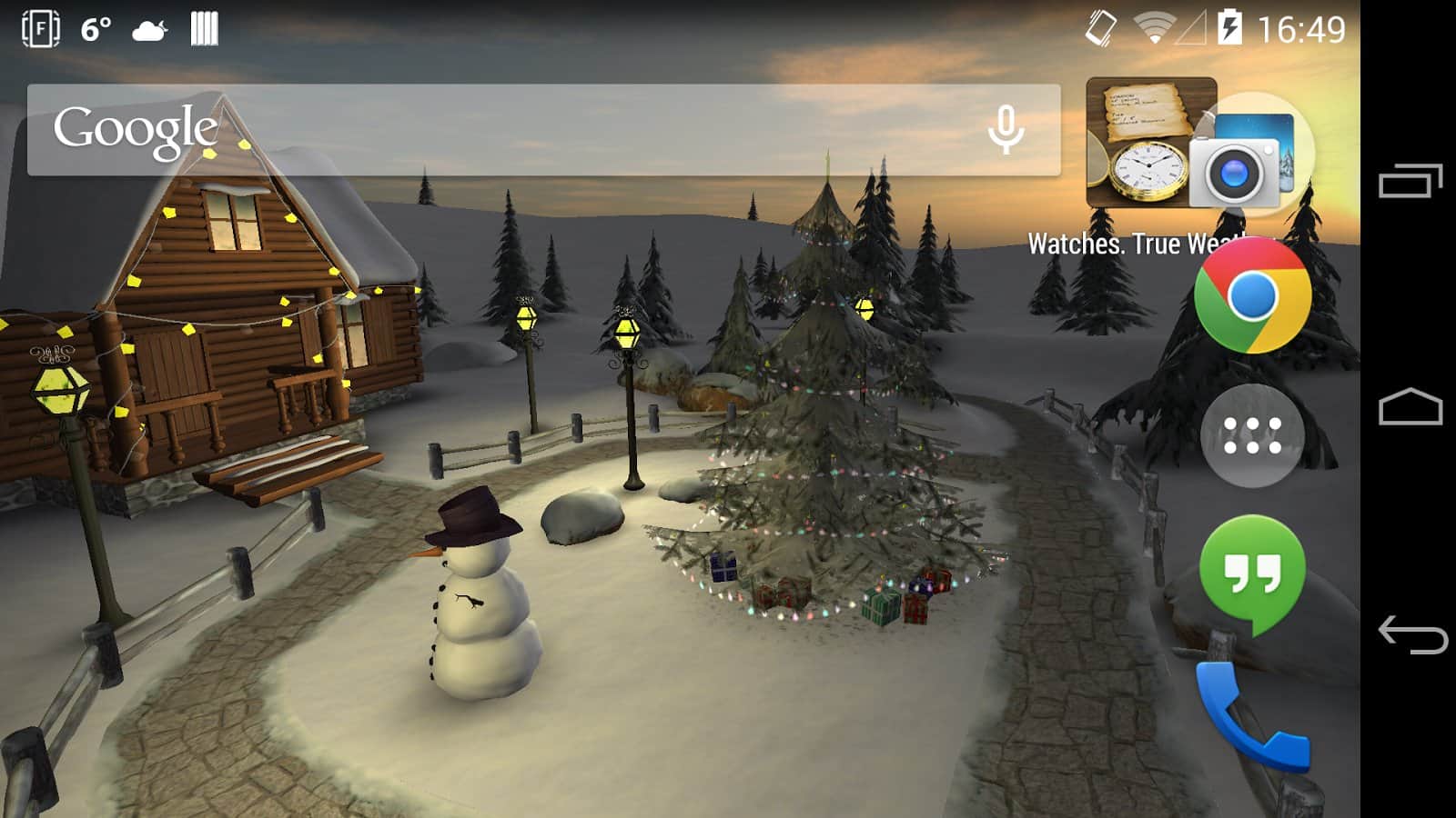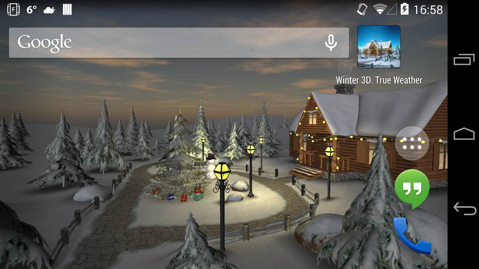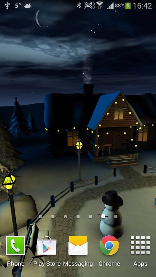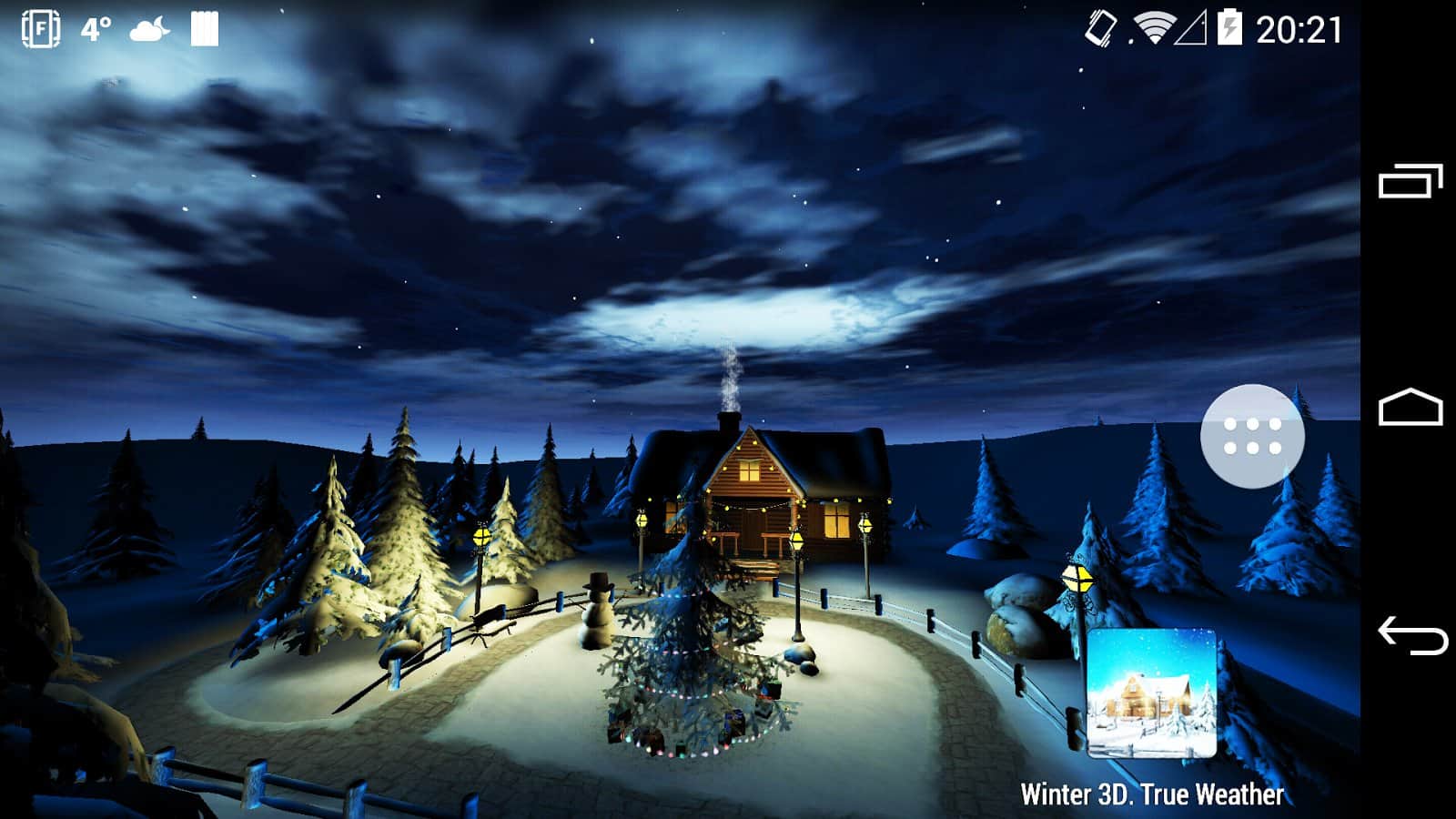 Winter 3D, True Weather – новогодние живые обои на андроид, будут как никогда кстати в преддверии нового года. Домик зимой, который уже украшен и подготовлен к новому году. Возле домика стоит нарядная ёлочка и снеговик. Обои могут похвастаться приятной красивой графикой, которая будет радовать обладателей этих обоев.
