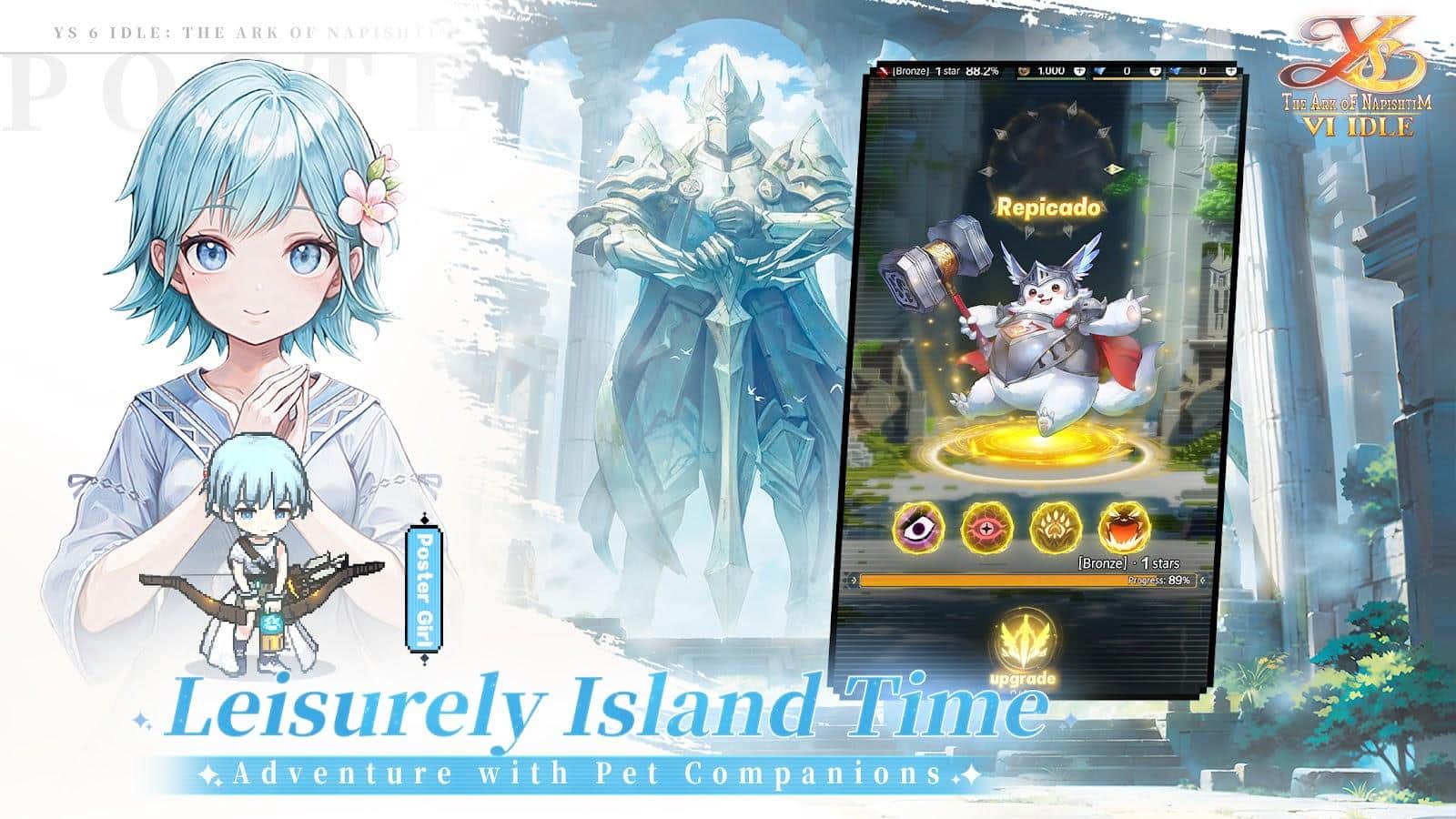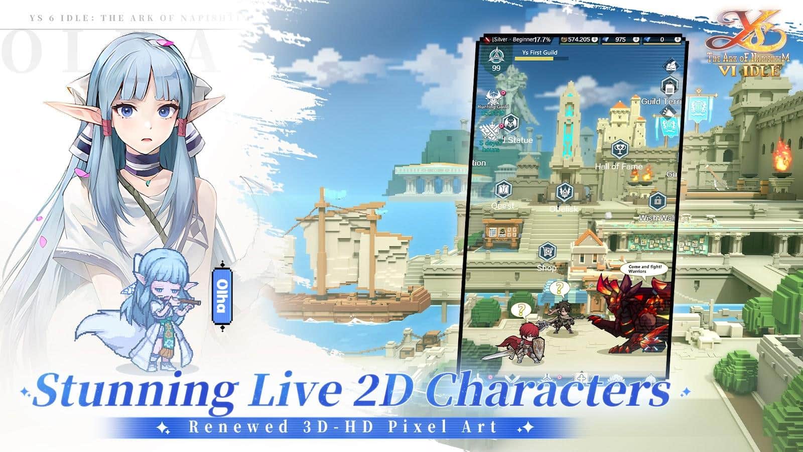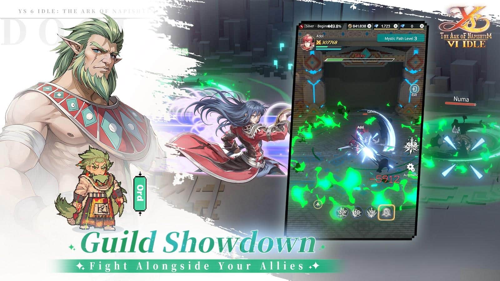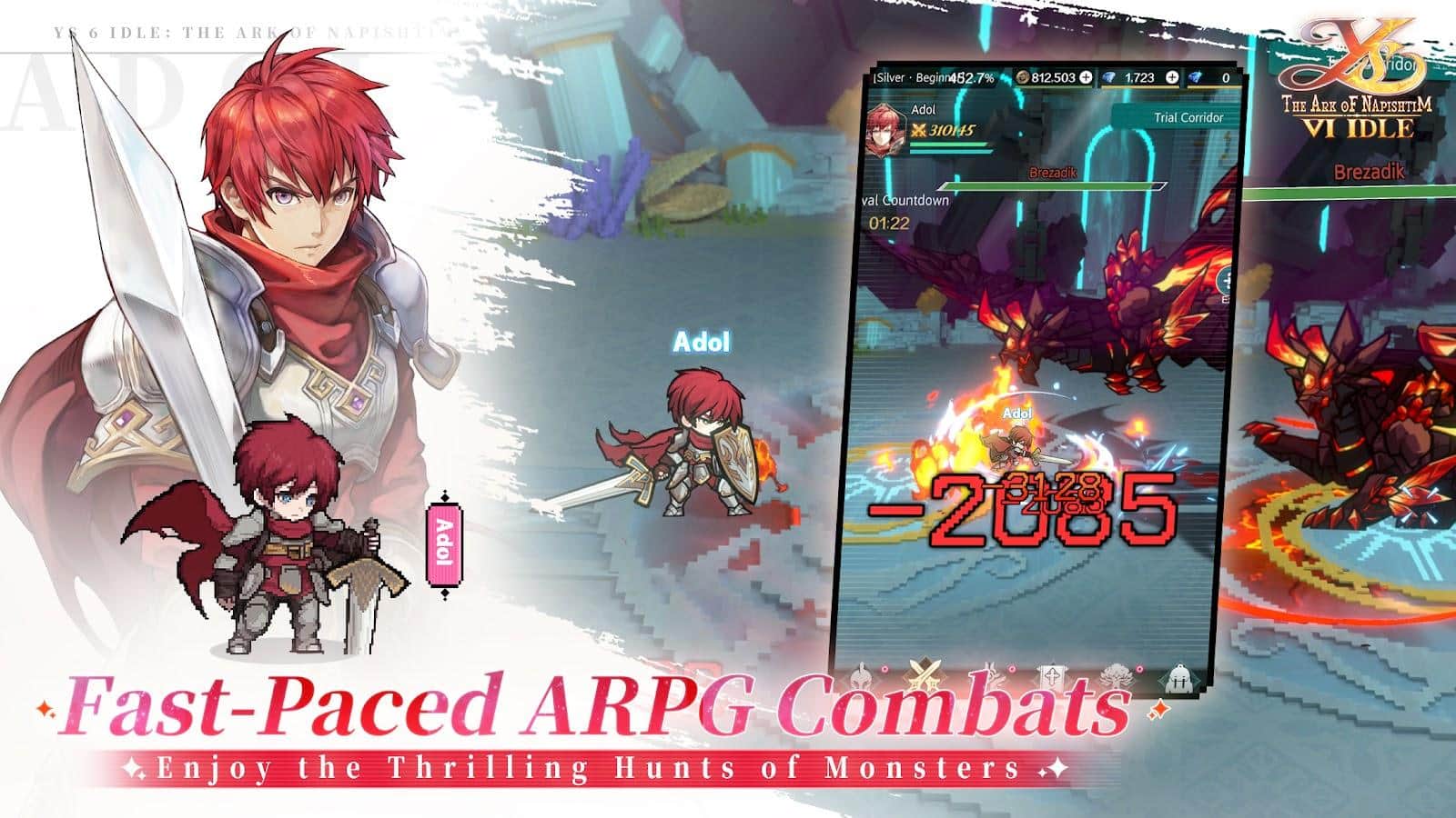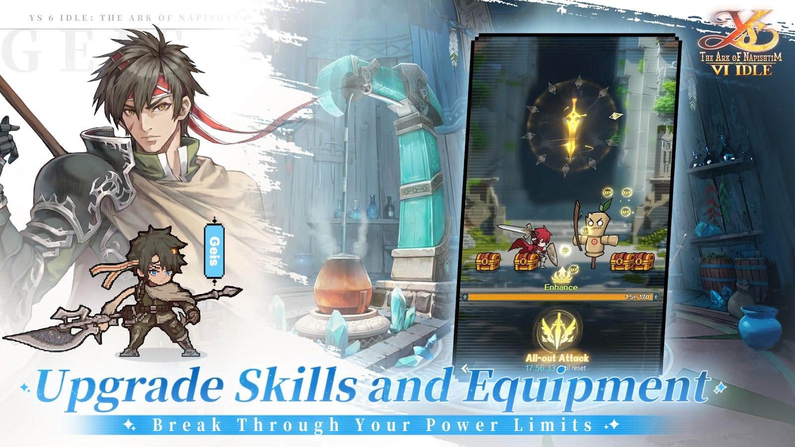 Ys 6 Idle: The Ark of Napishtim - це захоплююче повернення до світу захоплюючих пригод і епічних битв, представлене в унікальній 3D-HD піксельній графіці. Ця офіційно ліцензована РПГ від Falcom поглиблює гравців у історію рудоволосого героя Адола, який опиняється на таємничих островах Ханаан після порятунку двома загадковими ельфійськими дівчатами Олхой і Ішей. Острови Ханаан, з їх багатою культурою і давніми таємницями, стають ареною для незабутньої пригоди. Гравцям доведеться розібратися в складних політичних інтригах між місцевим племенем Реда та загадковими Арісіанцями, об'єднуючись з новими друзями та героями, щоб захистити свій новий дім від загроз.