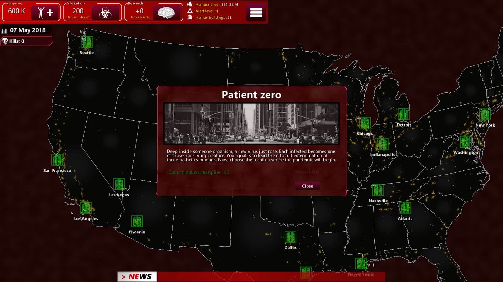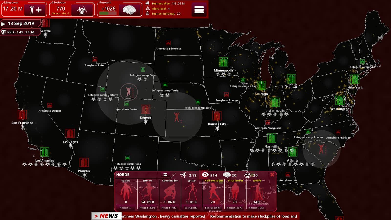 Zombie Commander – стратегія на андроїд, де ви будете поширювати небезпечний вірус по Сполученим Штатам Америки. Вашим завданням буде поширити вірус, як можна швидше і тим самим знищити все людство. Візьміть під свій контроль зараженого і проведіть його по різних картах, заражаючи місцевих жителів, армію і біженців. Знищити все людство за мінімальний проміжок часу і створіть цілі орди зомбі різних видів. Не дайте армії і вченим знайти ліки від вірусу і застосовуйте у своїй роботі різні технології.